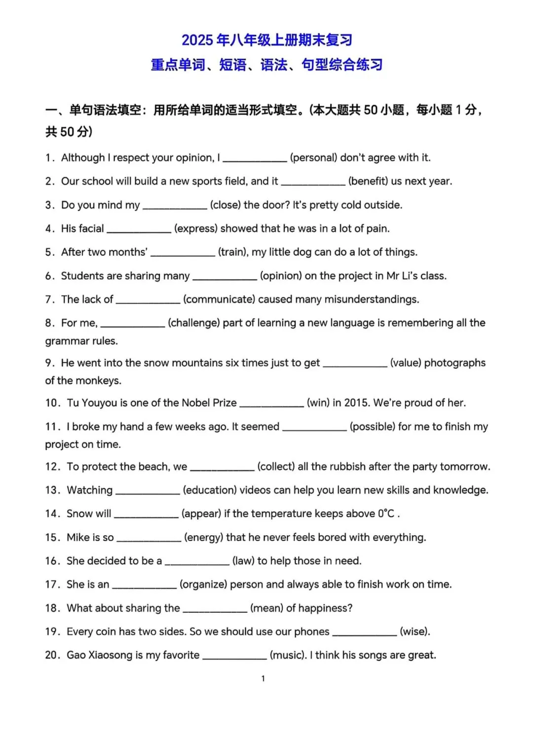 >2025年八年级上册英语期末复习:重点单词、短语、语法、句型综合练习专项练习