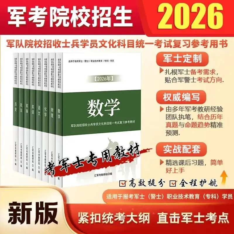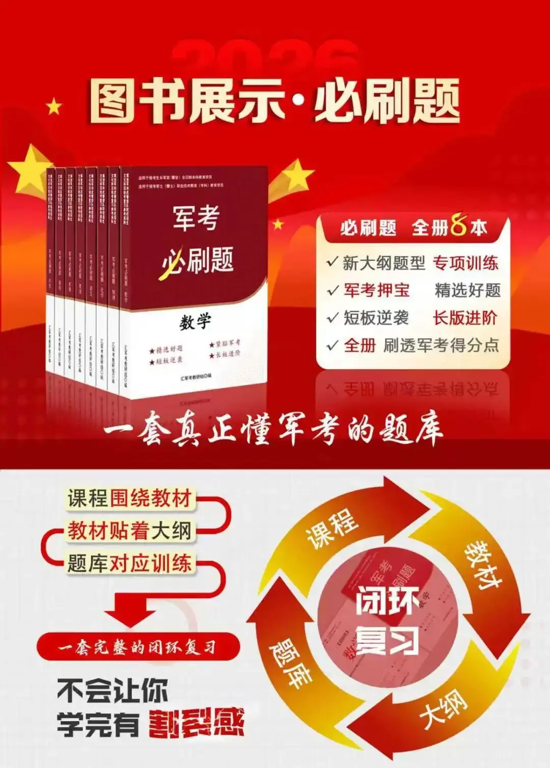 以押题为目的,适应目前军考试题改革方向,教材以基础和中档题为主,学完就练,练完就会,另外我们有配套的题库 题目和教材内容完全贴合,难度阶梯式分布,推荐每位战友必刷必做!