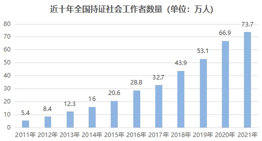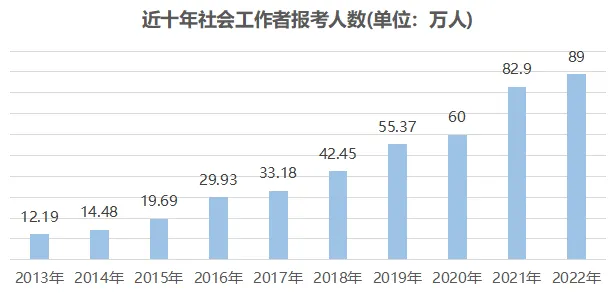 近十年来,社会工作师考试报考人数及持证人数逐年递增,每年增幅约为10万,可见社工考试热度之高。