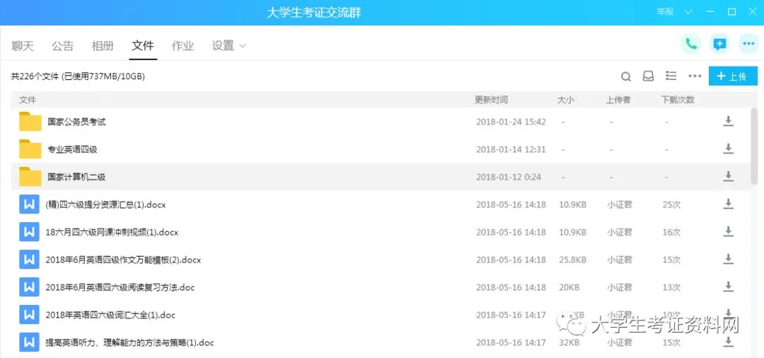 大学生考证资料网官方QQ及微信公众号成立于2017年2月14日,一年多来QQ累计关注人数突破2千,总浏览量达36万,发送说说400余条,微信公众号累计关注人数突破1万,发送文章400余篇,学习资料受益人群覆盖全国各大高校,未来的发展还需要大家一起努力,共同进步。小证君希望能一直陪大家,未来的一年,两年,甚至更久,不负昭华,感谢相遇。