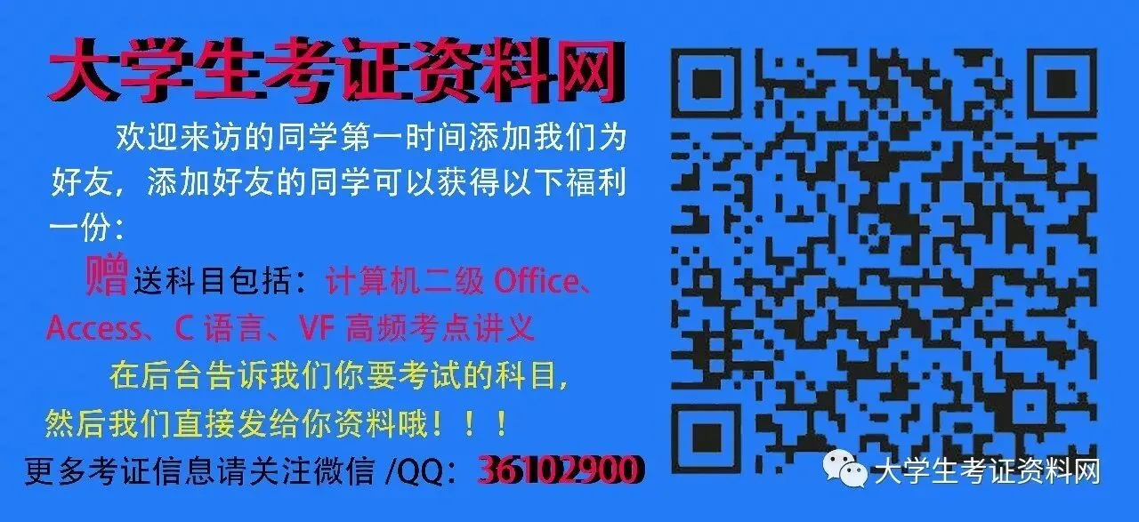 为回馈广大学生的支持,大学生考证资料网推出此推广活动,每分享推荐1位新用户即得以下8种资料奖励,同时我们的资料也在不断地改进,如果有更好的建议,留言区等着你;你们顺利通过考试是我们进步的最大的动力!
