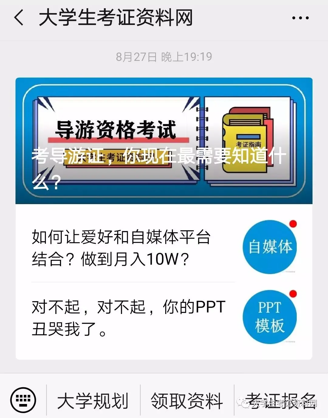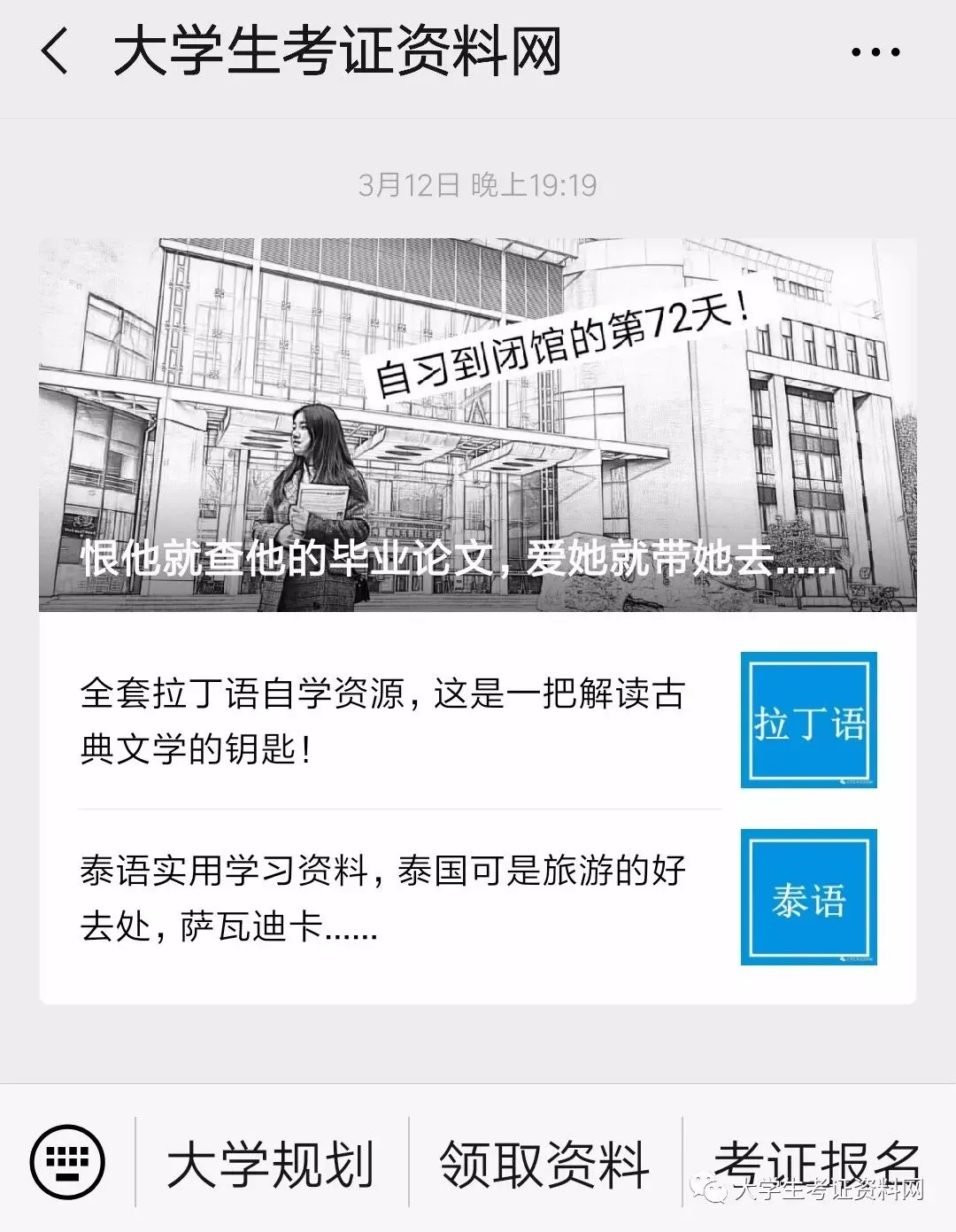 除了每天准时推送的各类资料,其公众号设立了大学规划,领取资料,考证报名的三个下方入口,给用户一个全局的了解。同时,该公众号从今年的3月1日开始进行改版,改版之后的推送信息更加美观和整洁。每日推送也更加有规律:每天一个考证资料和两个其他类别资源的推送。
