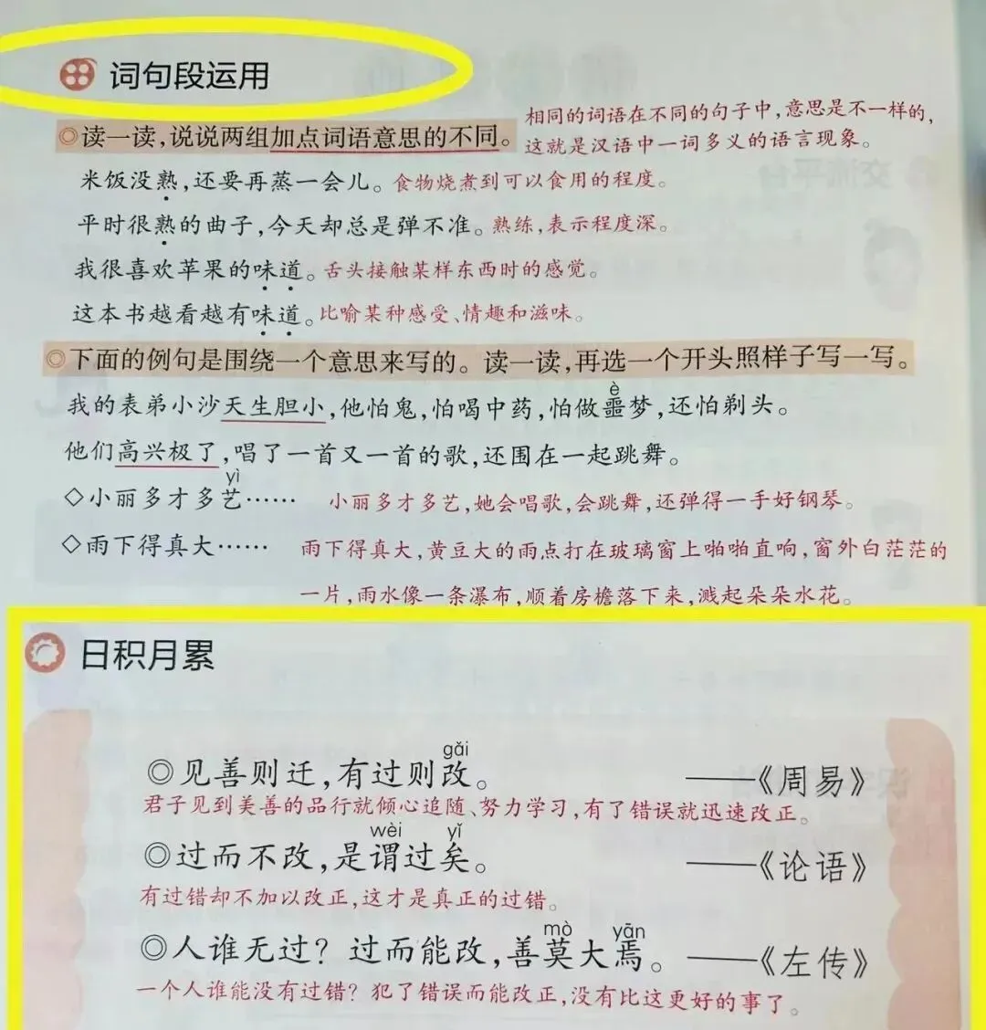 一问一答,复习每个单元的主题词汇以及AA、AAB、AABB、AABC、ABAC等词语拓展和固定搭配用法,积累关于颜色、季节、声音等不同主题的成语。一问一答/默写,巩固语文园地中 “字、词、句、段运用”部分的内容成语部分,可以用“挖词填空”、“成语接龙”、“你说我猜”等游戏来复习。语文课本“字词句段”运用可以侧面检验出孩子们在课堂的吸收情况,提升语感。