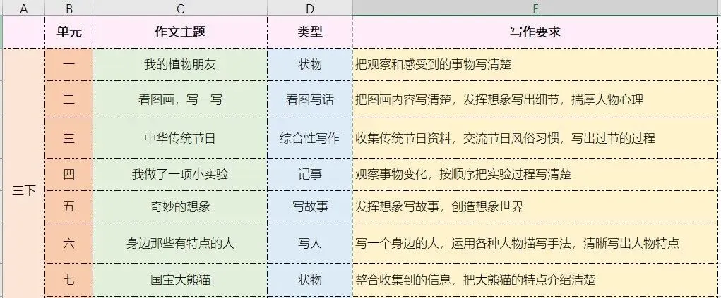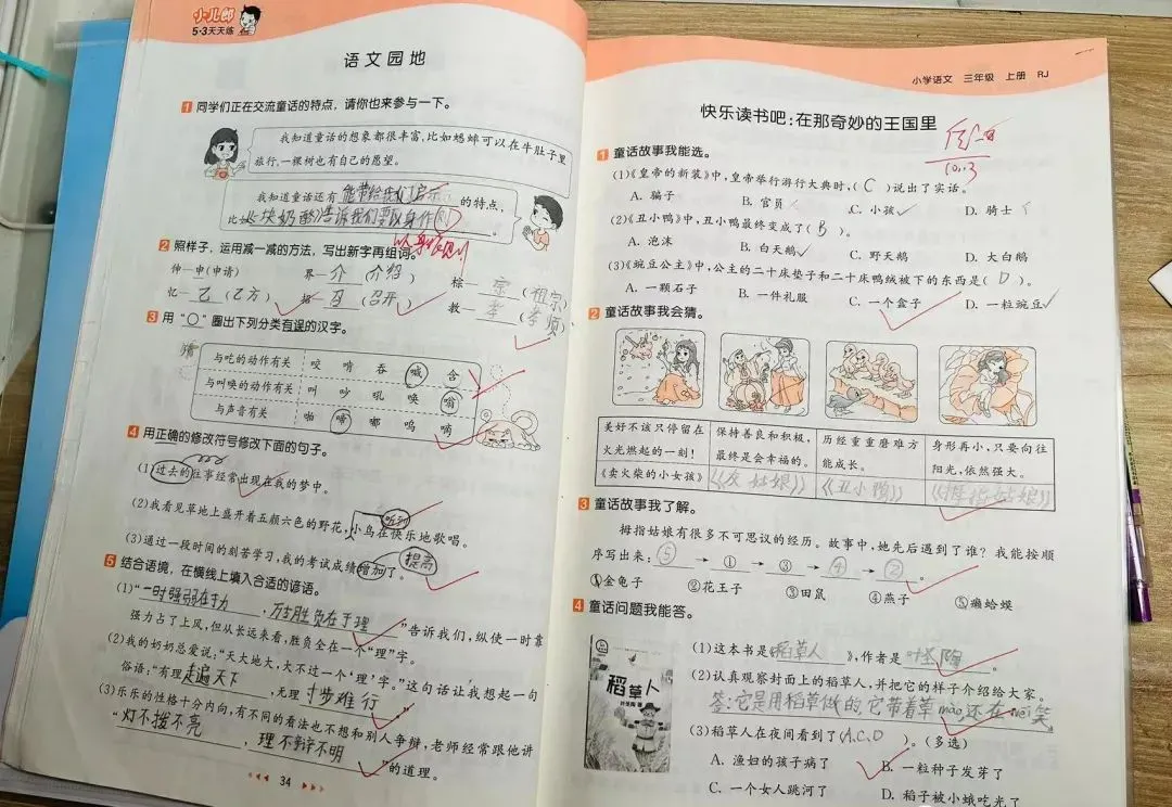 语文课本“字词句段”运用选段通过背诵复习,扫光其中不会写的汉字;古诗词、古文务必要通过默写复习。语文课本“日积月累”中的古诗文选段、名言佳句、识字加油站等边背诵边默写,必须全会!!每个单元“日积月累”部分是重要考点,不能带有侥幸心理,要着重扫清错别字和漏字。三年级语文课本阅读课后习题,是阅读理解的重要考察方向。课后习题换一个问法就可能成为考试中的考题。平日里的阅读贵在广博、重在思维提升;立足于培养关键信息提取能力、逻辑分析能力、思辨能力、总结归纳能力,这是阅读理解能力提升的基础——功夫在平时。日常我们也很重视这部分的训练,这学期月测阅读理解部分都很少丢分。而复习之所以要参考一些“标准答题范式”是为了更好应对考试,此时不重于“发散”而重于“收敛”;帮娃用更简洁的语言、更清晰的层次来归纳总结问题,迅速提升答题技巧;并把这样的“答题范式”举一反三,能为考试中的“课外阅读理解”板块助力。写作能力的提升和积累重在平时,期末主要是激活一下过往的积累。根据前辈分享的经验来看:三年级作文考试一般都会参考单元作文的要求,换汤不换药。类似“季节”、“人物”、“景物”描写、事件及过程描写是重点考察范围。我也分享过带娃写作的过程,还自己梳理过三(下)语文课本每个单元的主题作文。我将语文课本单元作文的要求汇总展示出来,直观看一下课本上作文对孩子们的要求主要有哪几方面。结合下图同步作文类参考书,根据题目要求找到作文的关键词,让孩子们体会主题作文的特征。我们做的教辅和试卷不多,但我想重要不在于“量”——做卷子的目的就是为了用“检索”方法检验、复习巩固所学,通过做题有所反馈、针对提升,并作为期末复习的重要参考。按照模块复习完,最后过一遍做过的教辅材料。把每课写的字词默写、做过的卷子拿出来,专门看错题,看重、难点。校内教辅《53天天练》关注错题/重点