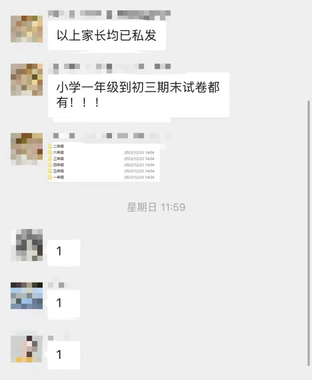 “小学一年级到初三期末试卷都有,要的家长接龙……”