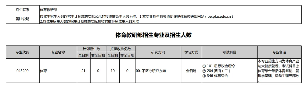 2025年北京大学体育教研部拟计划招收全日制统考体育硕士10人(不含推免)。