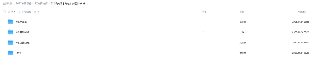 百度云群中资料每天自动更新,不用再手动保存到自己网盘,而且资料整理有序,比如有道(唐迟)全程班的课程在百度云群组中是下面的样子: