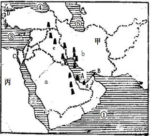 ² 近路:a波斯湾→①霍尔木兹海峡→b阿拉伯海→c红海→②苏伊士运河→d地中海→③直布罗陀海峡→C大西洋→(甲)西欧