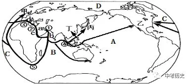 ² 远路:a波斯湾→①霍尔木兹海峡→b阿拉伯海→B印度洋→⑤非洲好望角→C大西洋→(甲)西欧