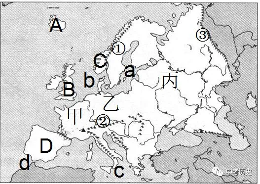 “三洲”:甲:亚洲 乙:欧洲 丙:非洲