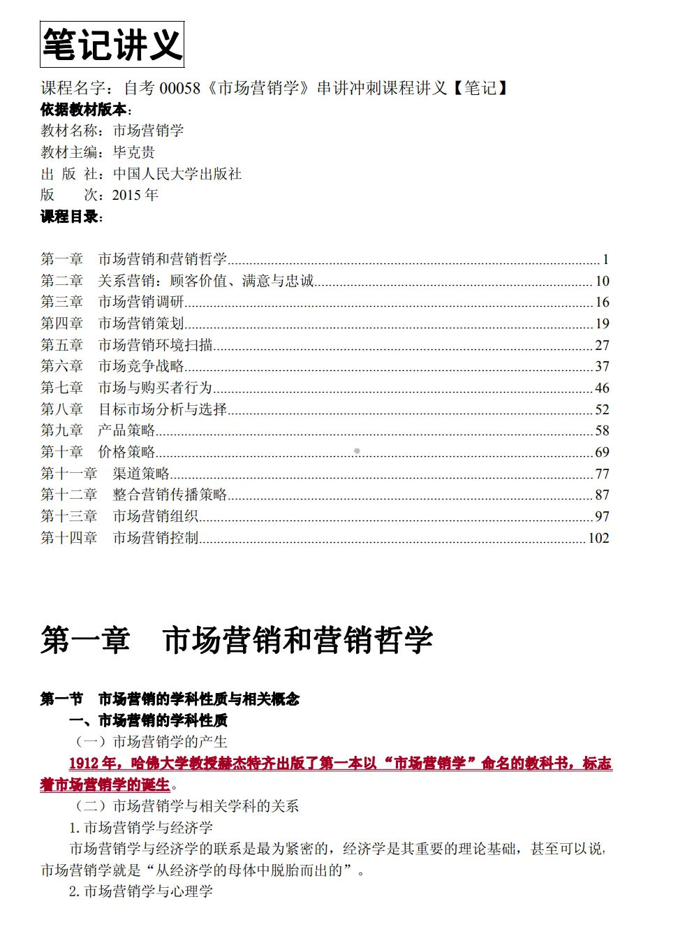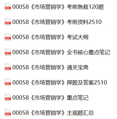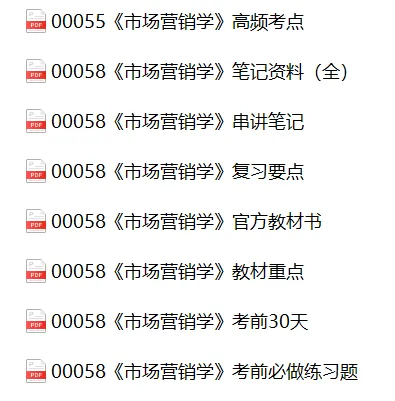 Hi,同学们好!本期给大家分享的复习资料:自考00058《市场营销学》复习资料+重点笔记+考前密训+全书笔记+押题答案+视频资料+PDF教材。