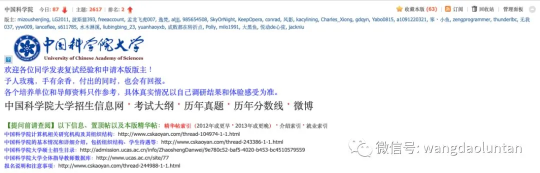 如果你要找相关学校信息,打开任何一个学校的版块,以中国科学院大学为例,学校专版最上面是学校官网和基本信息索引,下面是各类精华帖,包括经验贴、考研真题、复习方法和资料、专业就业情况等等。中国科学院各个所的相关信息都有,在这里我只是截了一部分。
