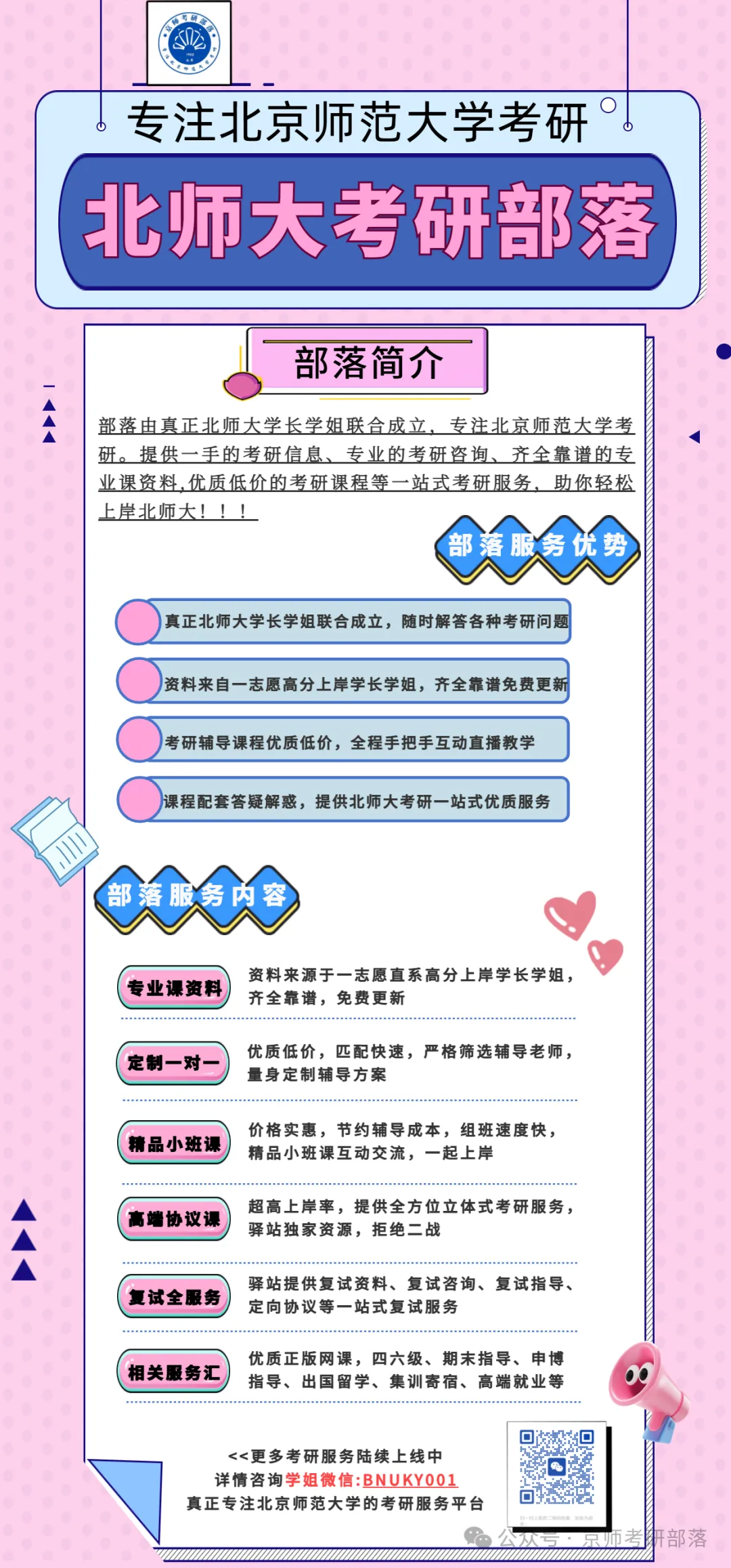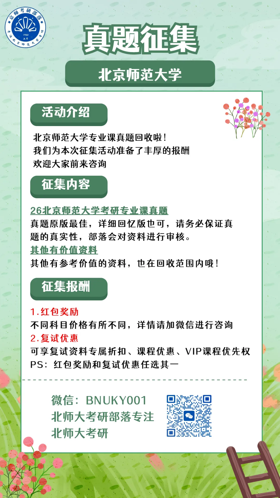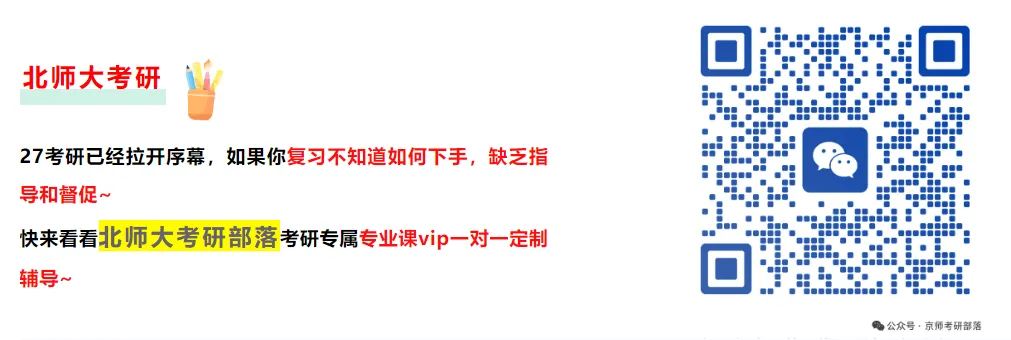 学长学姐们分享的宝贵考研资料,为备考路上的学弟学妹精准点亮了方向,助力大家避开备考误区、高效冲刺~ 为感谢这份无私分享与热忱助力,北师大考研部落特意准备了专属红包奖励!感兴趣的学弟学妹们,快扫描下方微信二维码添加好友,咨询领取福利吧~