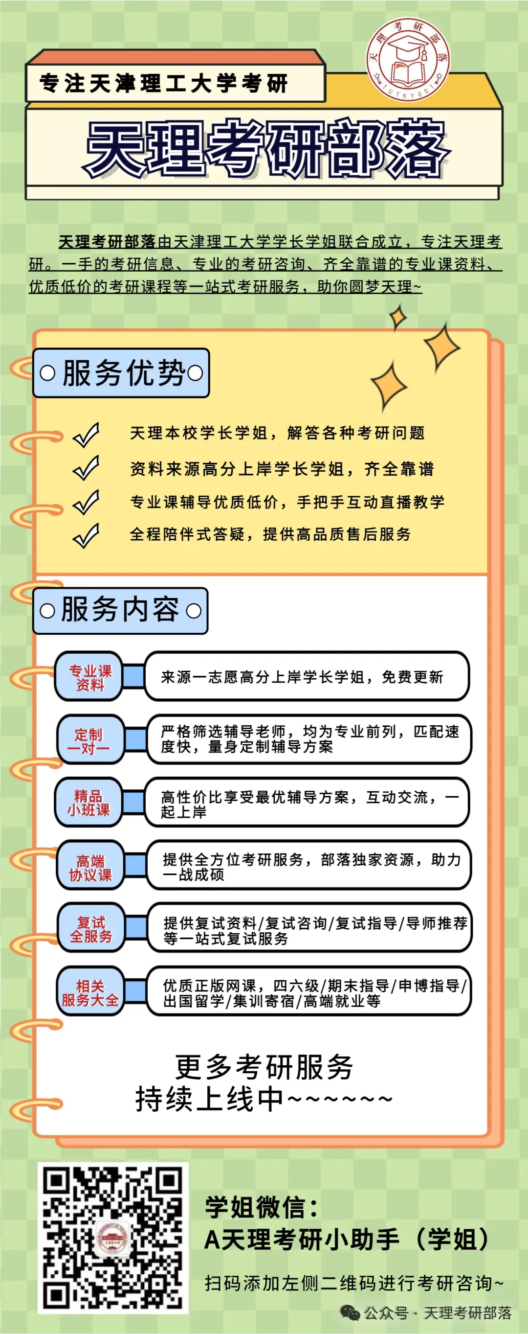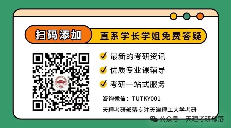 部落之前推出的一对一辅导,广受学弟学妹好评~感谢大家信任~希望大家持续关注我们,部落会继续努力,为大家输出更多优质的内容~咨询更多天津理工大学考研复试相关问题及复试服务详情,请扫下方微信二维码,天理直系高分学长学姐为你答疑解惑哦!!!需要更多天津理工大学考研考研相关咨询,请扫下方微信二维码,会有天理直系高分学长学姐为你答疑解惑哦!!!