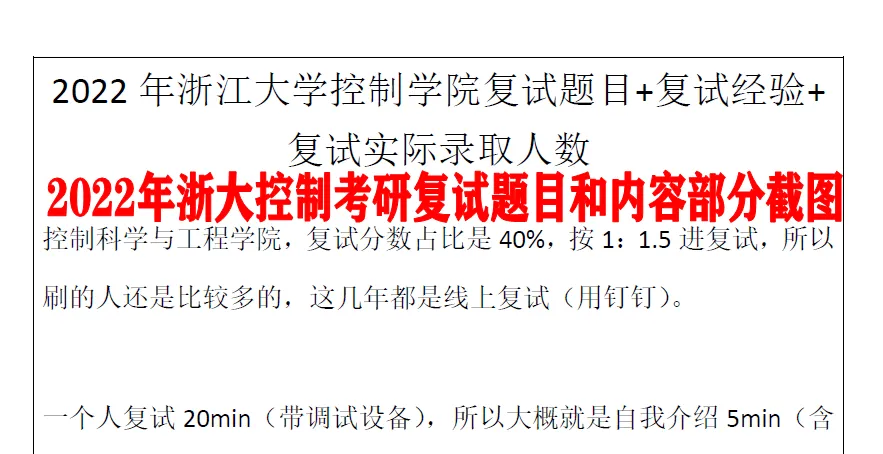 对多年来浙大控制复试每组题目以及每个老师的考题进行了整理和汇总,足足有三十多页,十分齐全,很珍贵!可以说是一个详细的浙大复试题库!为了复试保险,最好认真复习此项。
