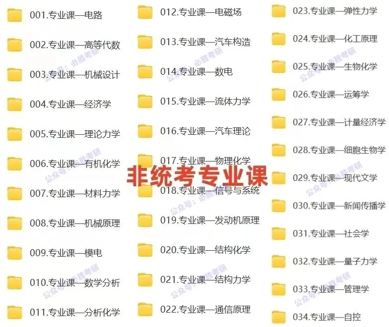 管综、西综、396经济类联考、法硕、计算机、教育学、心理学、护理综合、中医综合、经济学、统计432、金融431、资产评估、保险、税务、国际商务、新闻传播、机械原理、机械设计、翻译、汉语国际教育、349药学综合、马克思主义理论、信息系统、历史学、社会工作、电路、日语、体育、农学、口腔综合学、中西方音乐史、中外美术史、设计概论教育学、艺术概论、公共卫生、自动控制、数字经济、工业设计、物理化学、高代数分、电气电分、电力电子、数电模电、材料力学、理论力学、结构力学等