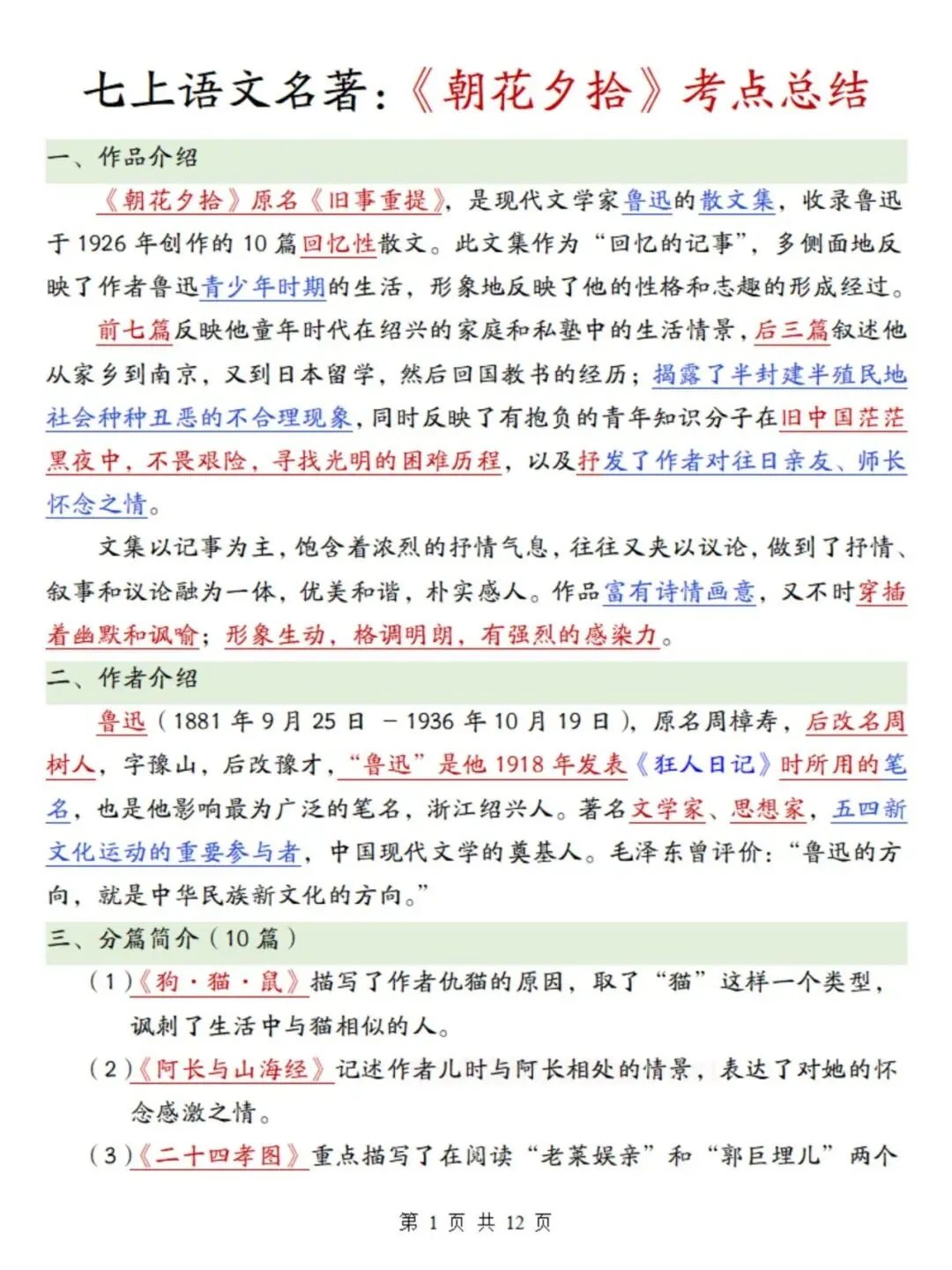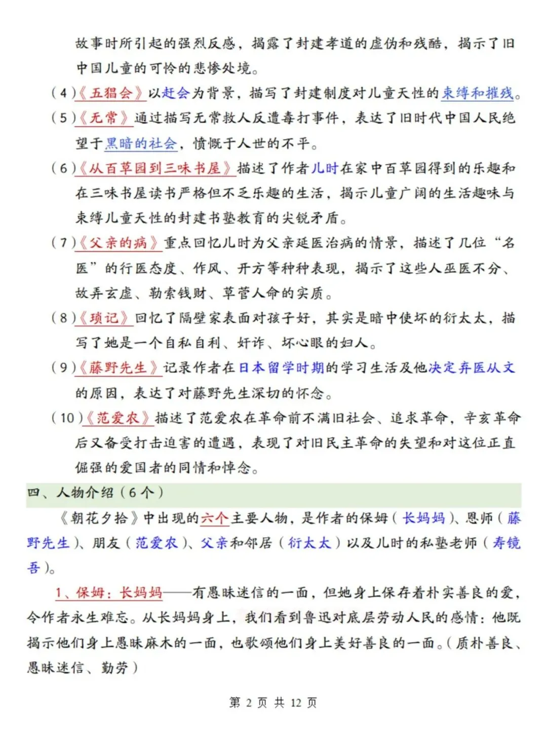 七上语文期末复习重点必备:必读名著《朝花夕拾》考点总结及练习