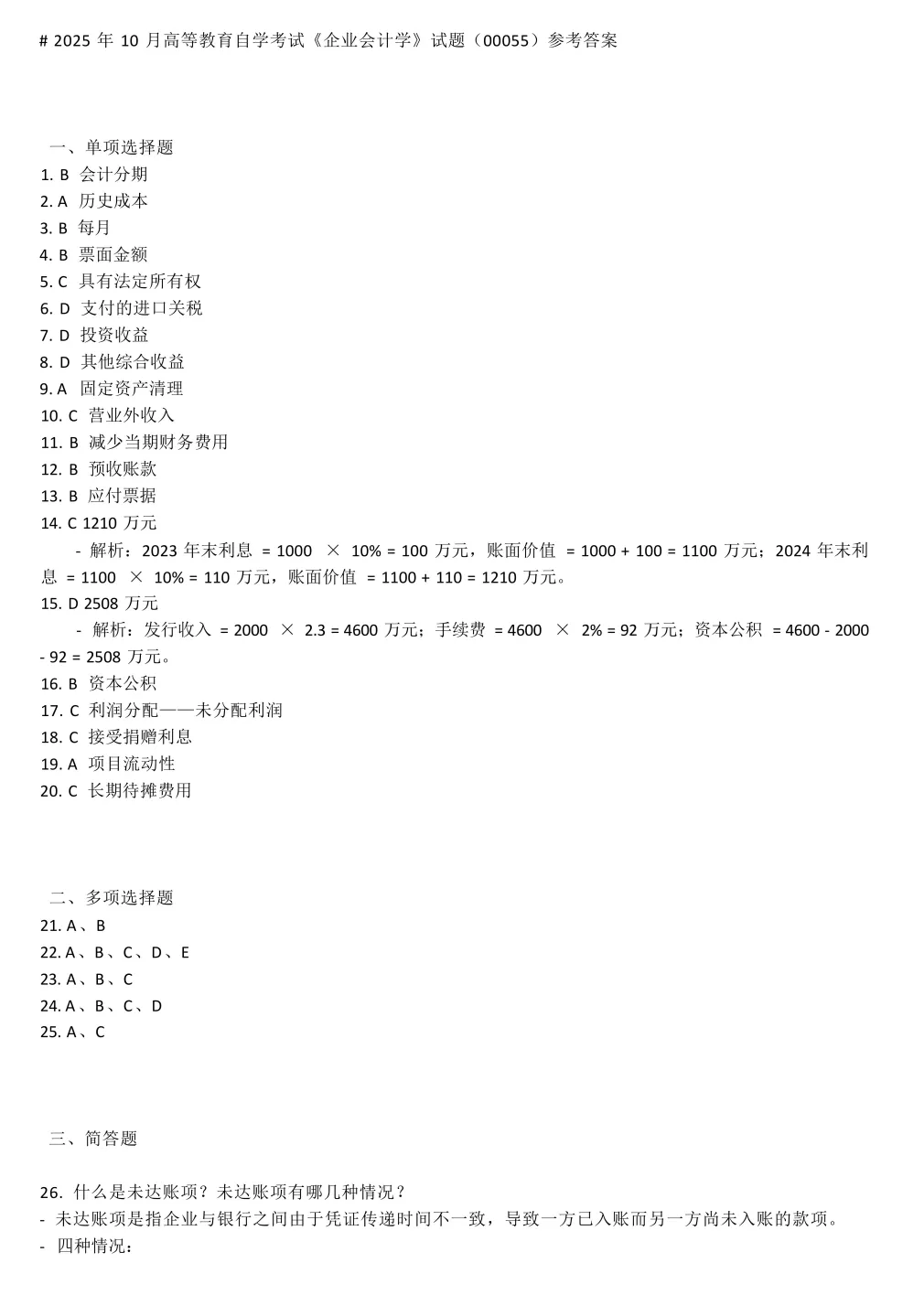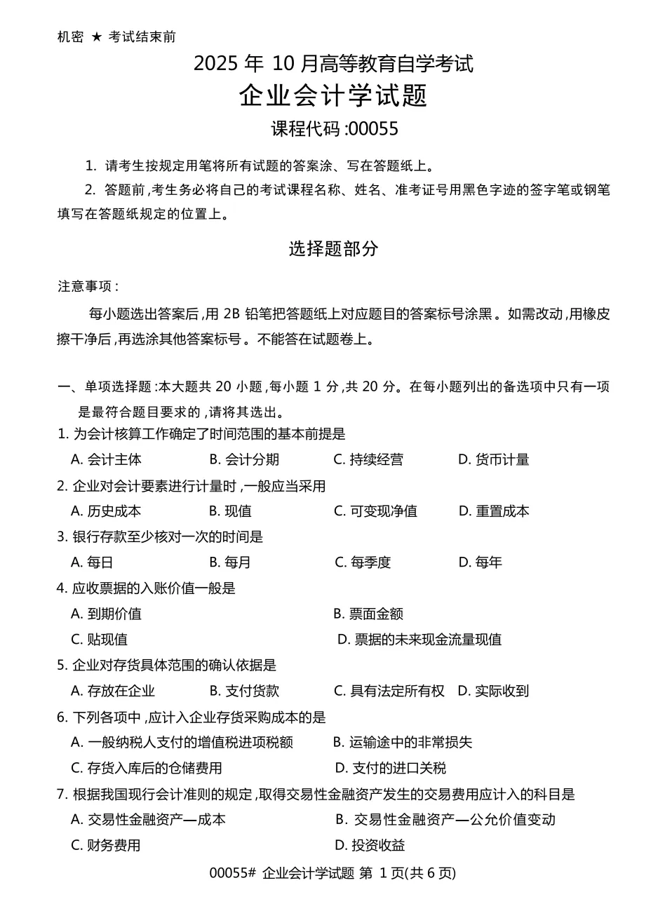 资料二:自考00055《企业会计学》历年真题及答案【更新至25.10】