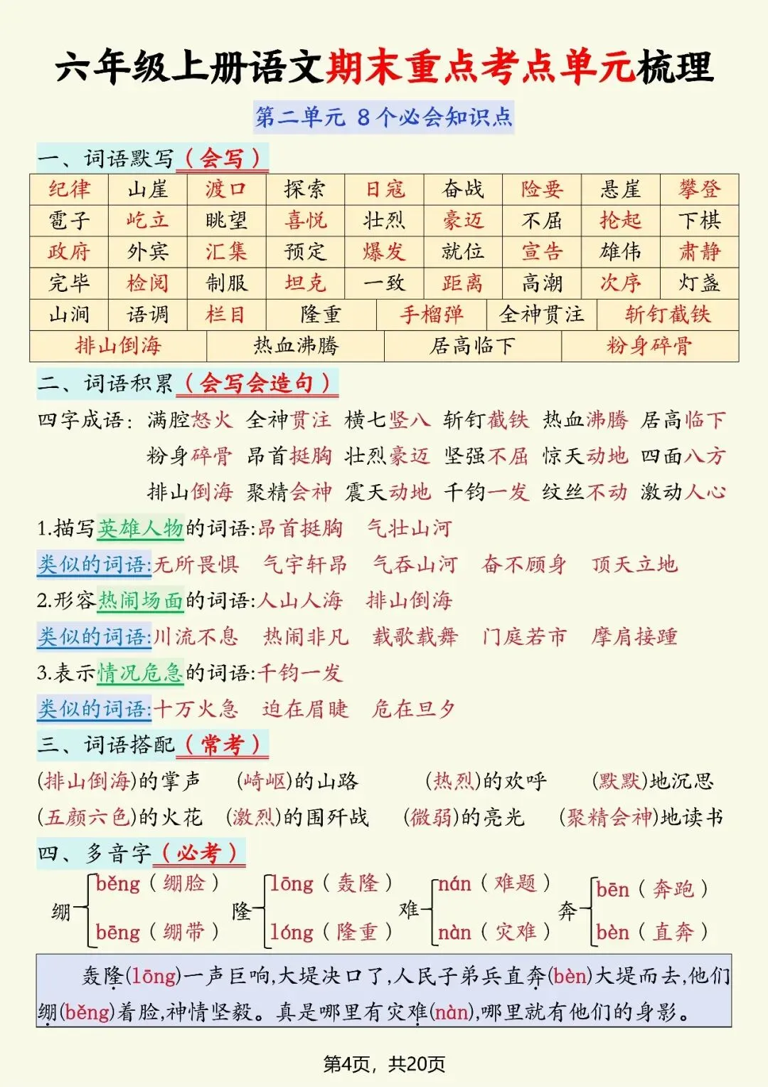 📖✏️25 秋六年级语文上册期末复习神器来啦!重点考点单元梳理超全超精准💯 课文重难点、生字词易错点、阅读理解答题要点、日积月累必背清单… 按单元划分清晰明了!不用再瞎翻书整理笔记,娃直接对照复习,查漏补缺超高效✅ 小升初衔接也能提前铺垫,基础分稳稳拿捏!家有六年级娃的快码住❗ 期末复习效率翻倍,冲刺高分超有底气~# 六年级语文 #期末单元梳理 #小学语文复习