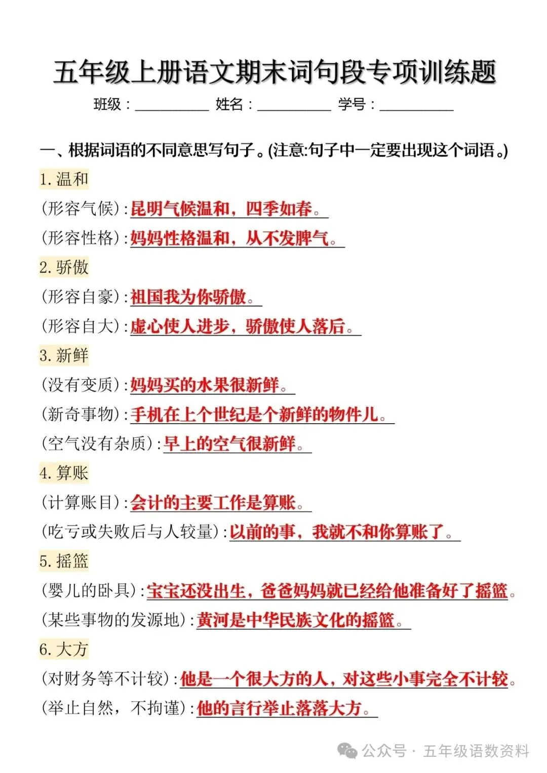 最近,后台不少家长学生询问学习资料,今天老师准备了五年级上册语文期末词句段专项训练题,家长记得给孩子收藏学习哦!