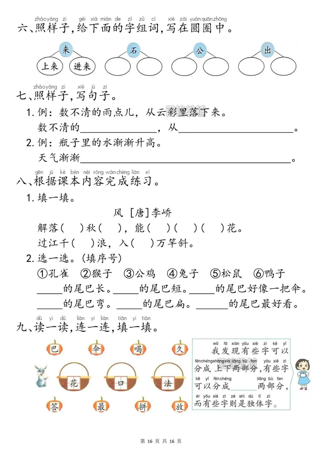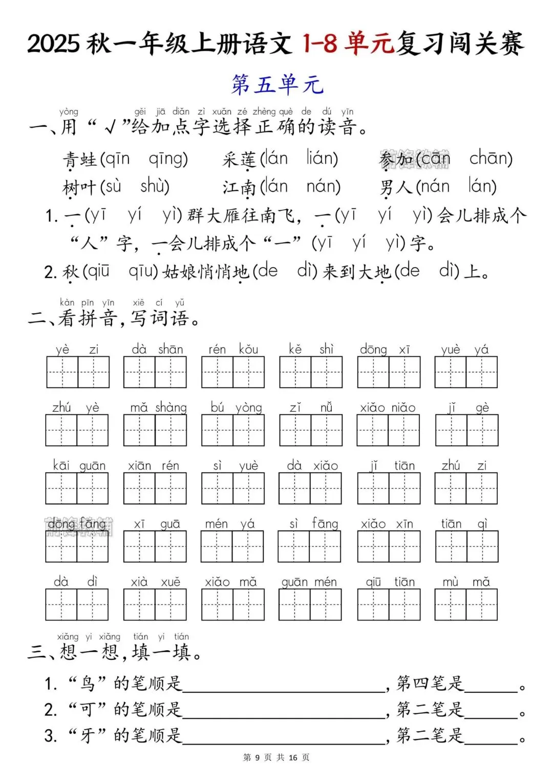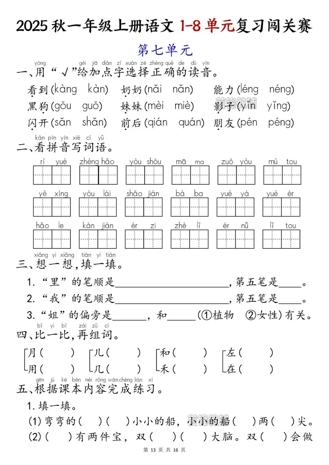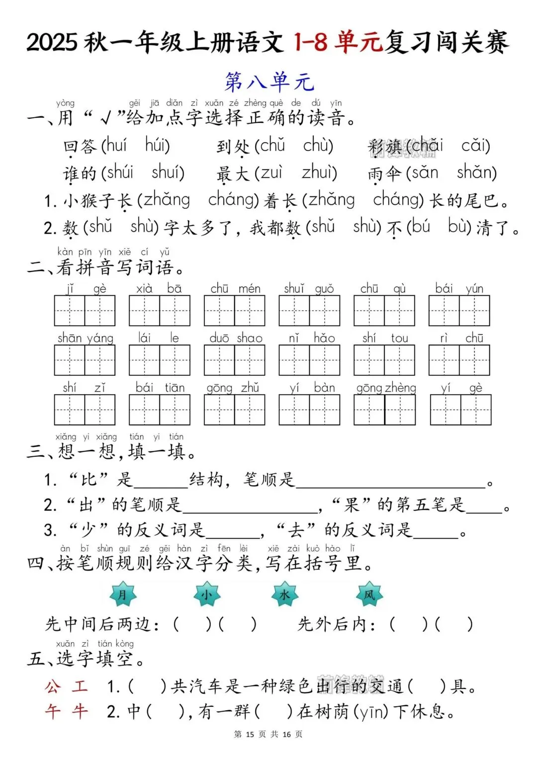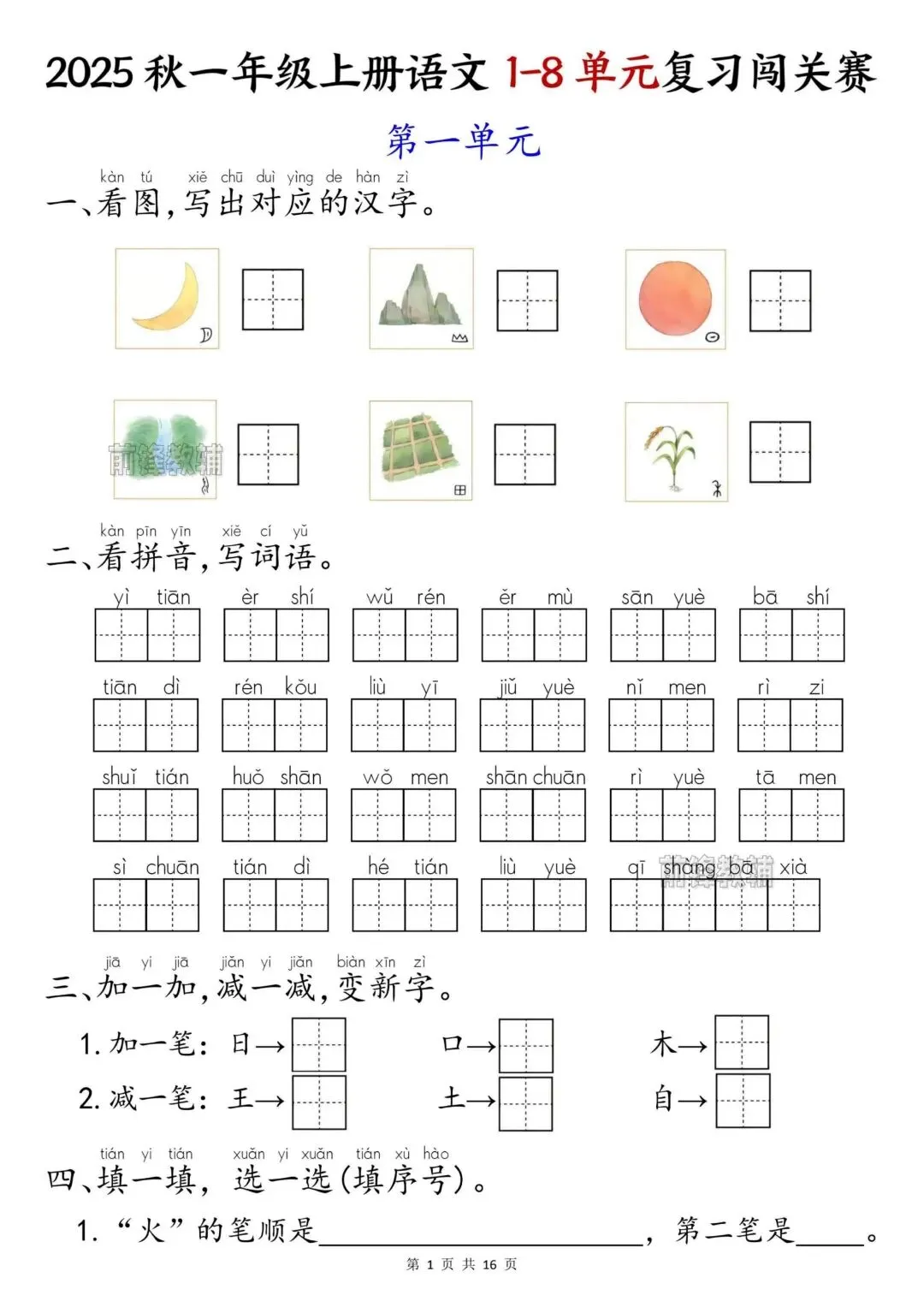 >一年级上册语文1-8单元重点汇总复习资料电子版可打印!