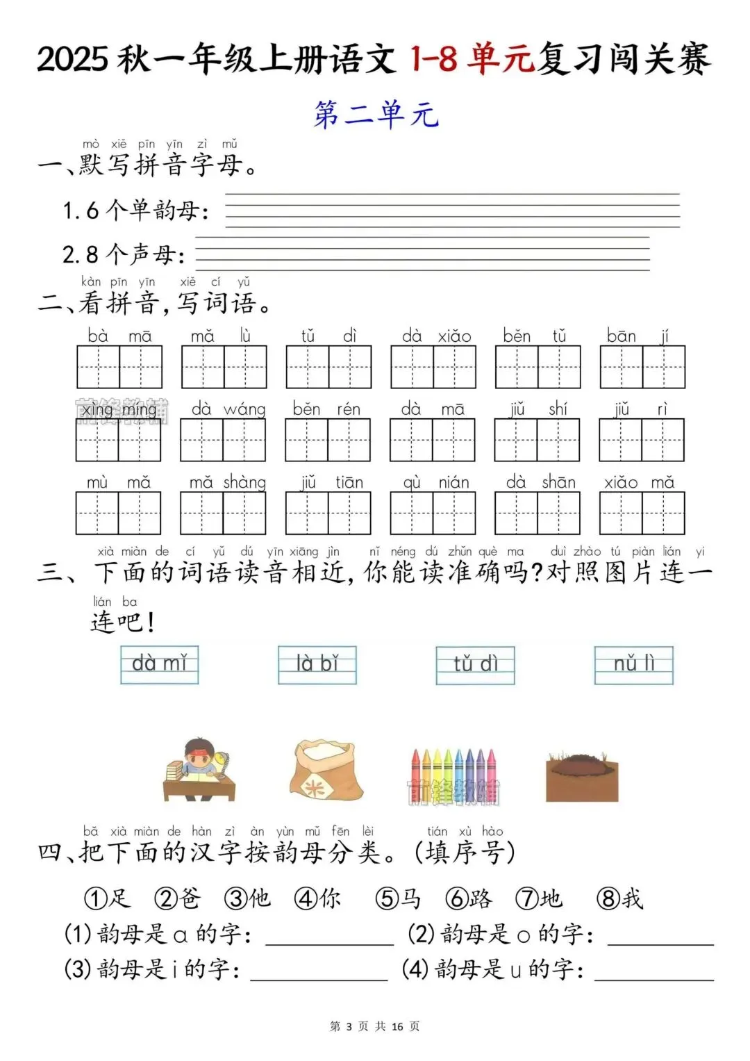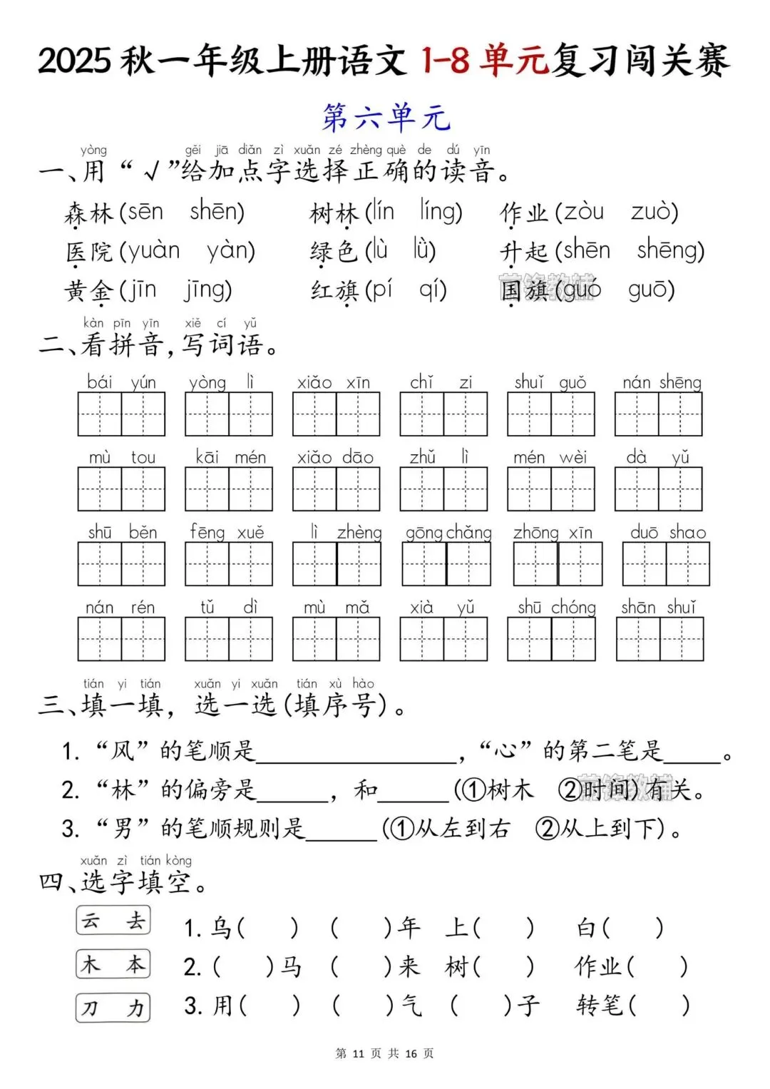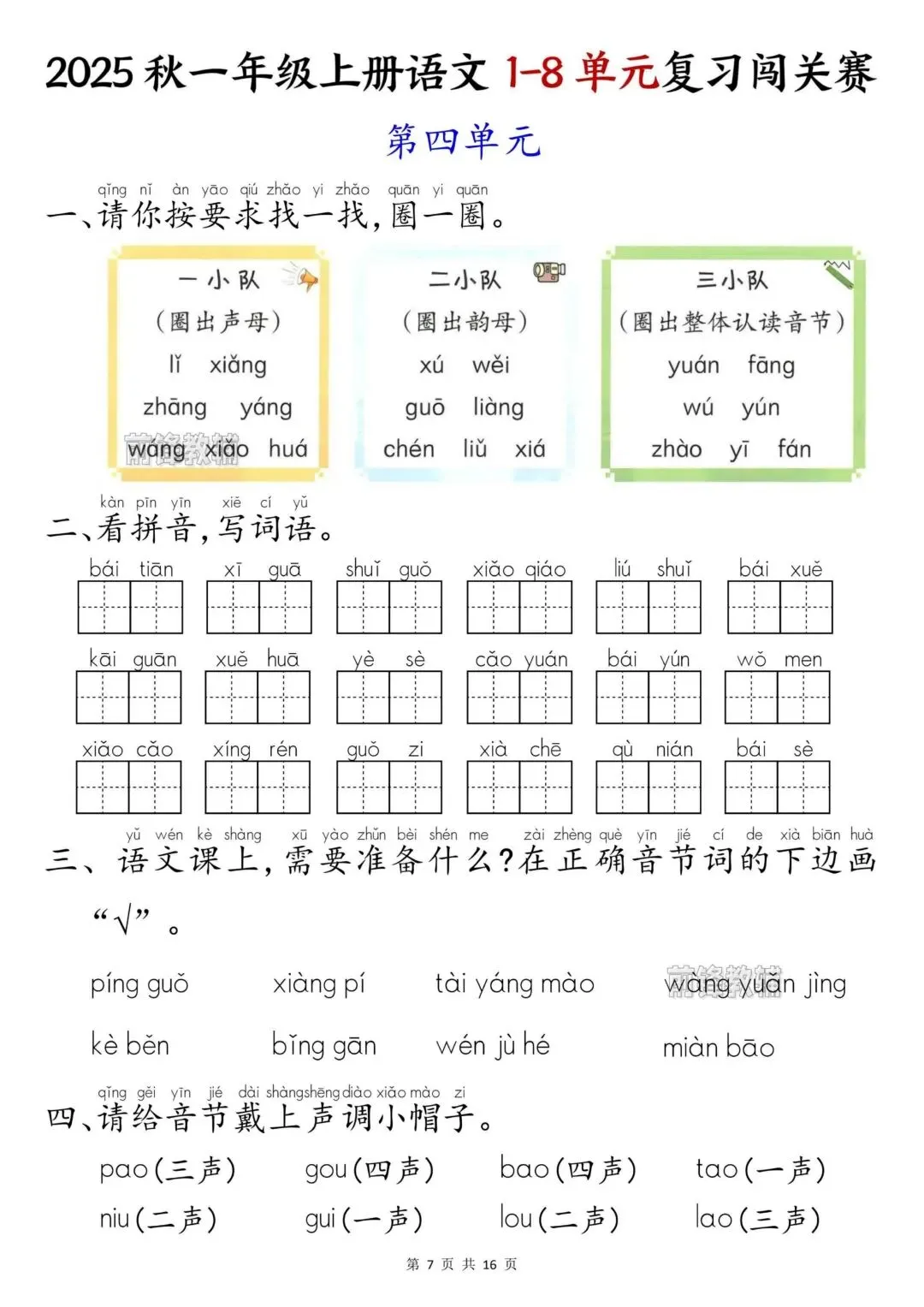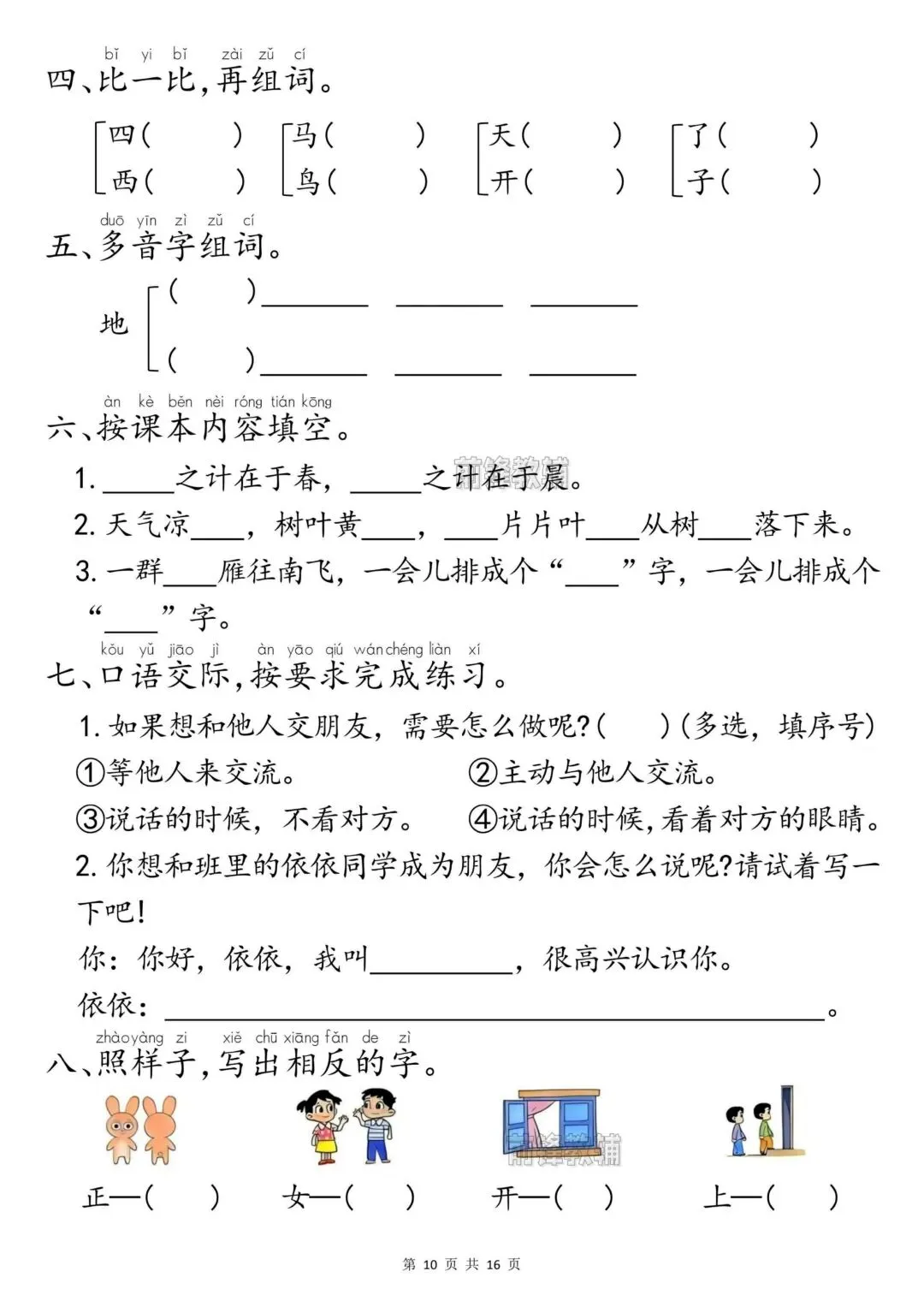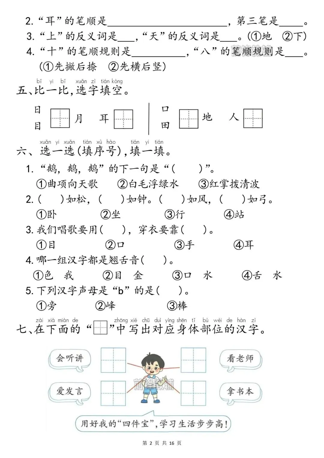>一年级上册语文1-8单元重点汇总复习资料电子版可打印!