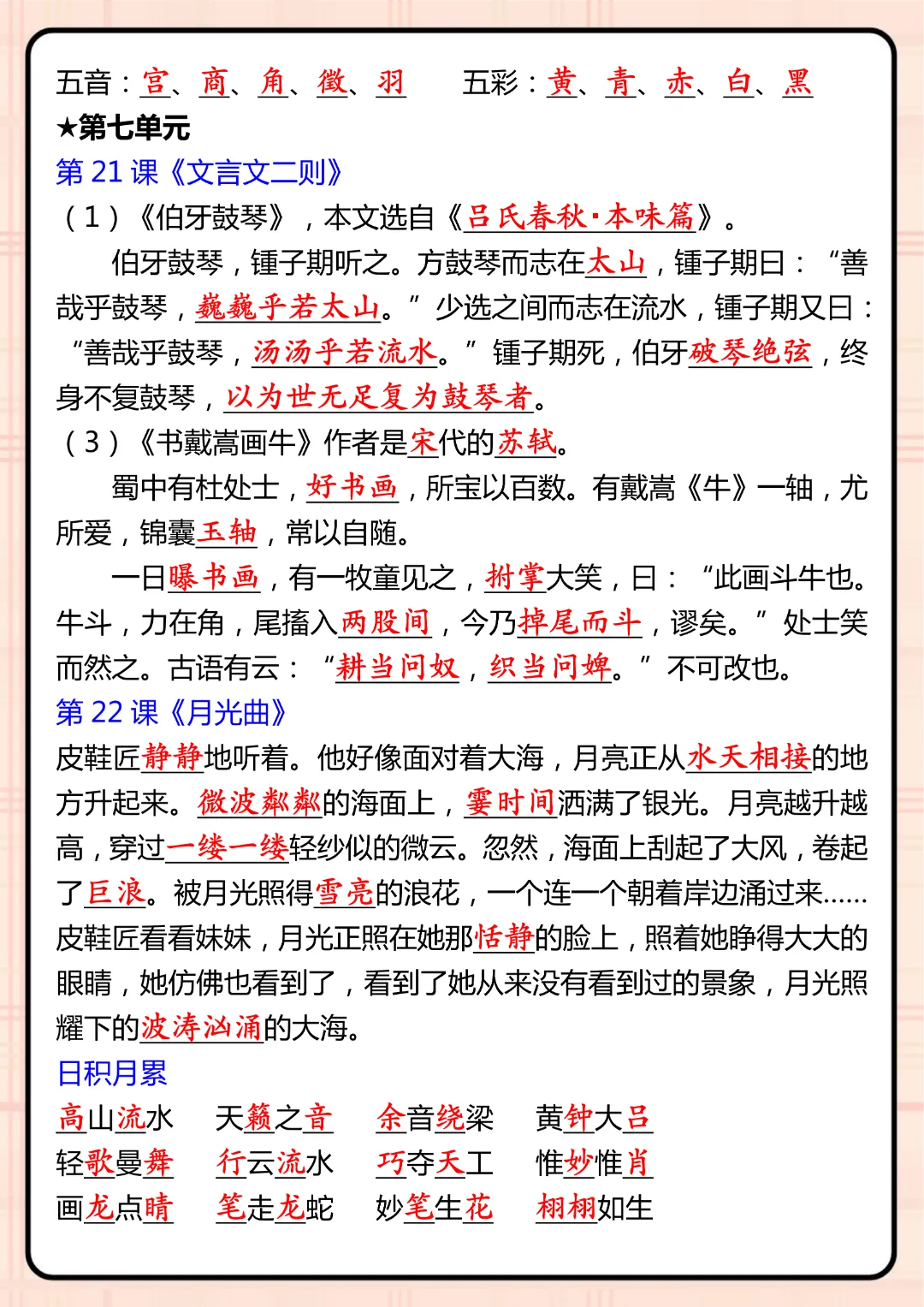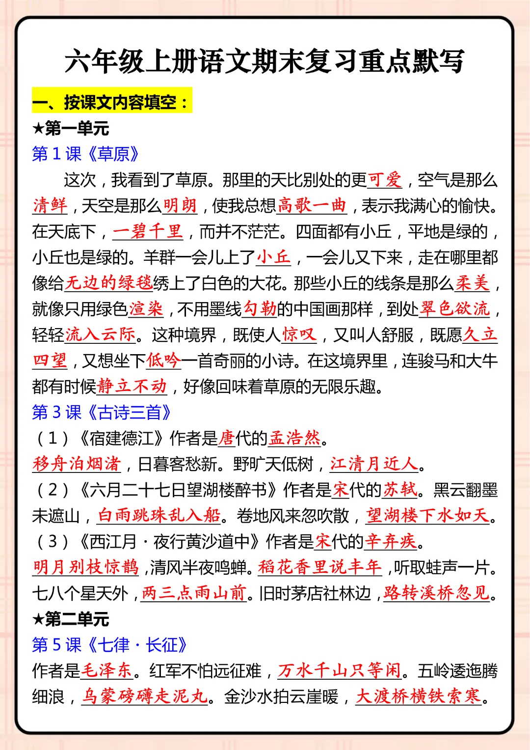 >六年级上册语文期末复习重点默写(按课文内容+日积月累)