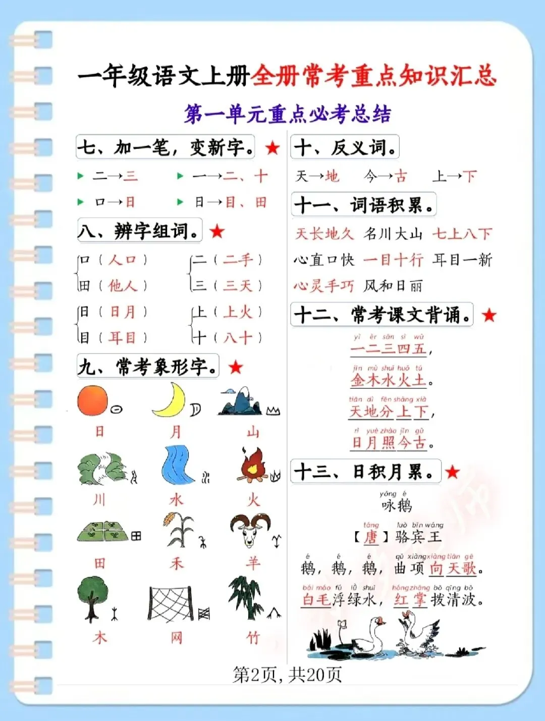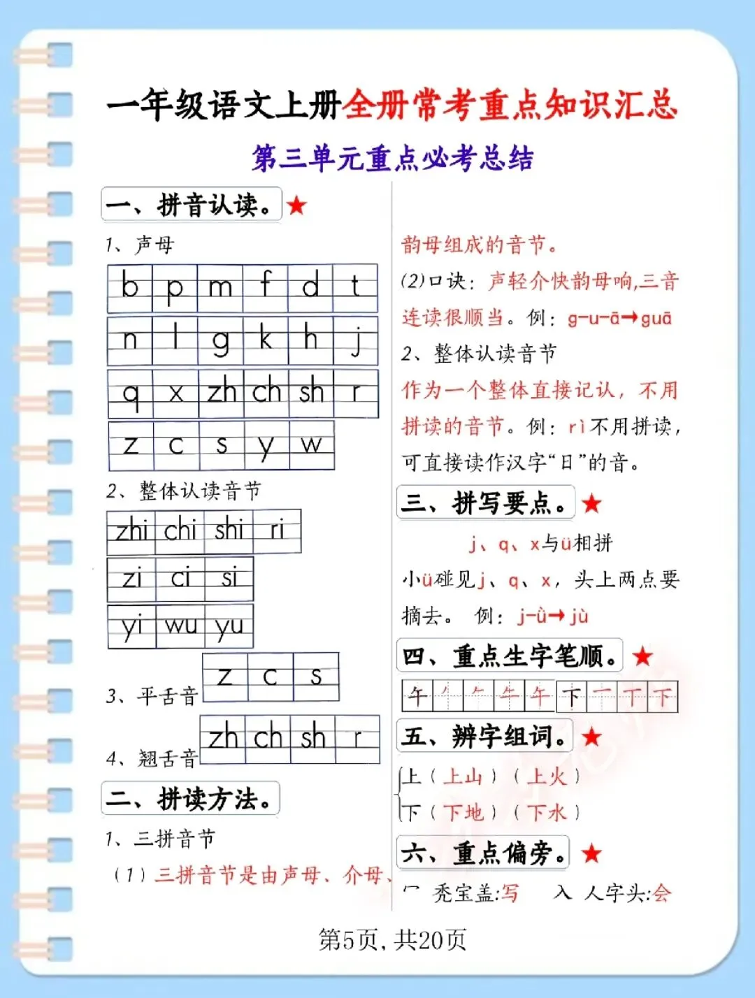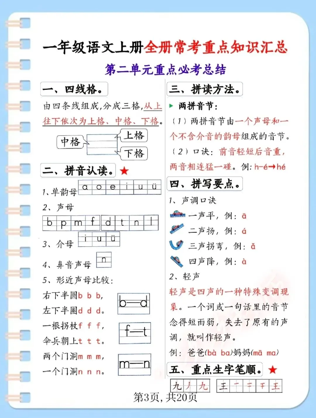 一年级上册语文1-8单元复习资料来啦!生字、拼音、单元重点全梳理,考点精准划,家长省心娃提分!期末复习不用愁!紧扣课本考点,帮孩子高效查漏补缺!评论区留言速领这份复习资料吧!1-6年级都有哦。轻松掌握没有压力,电子文件打印即可使用。需要的文末点【赞】和【在看】找小编领取。