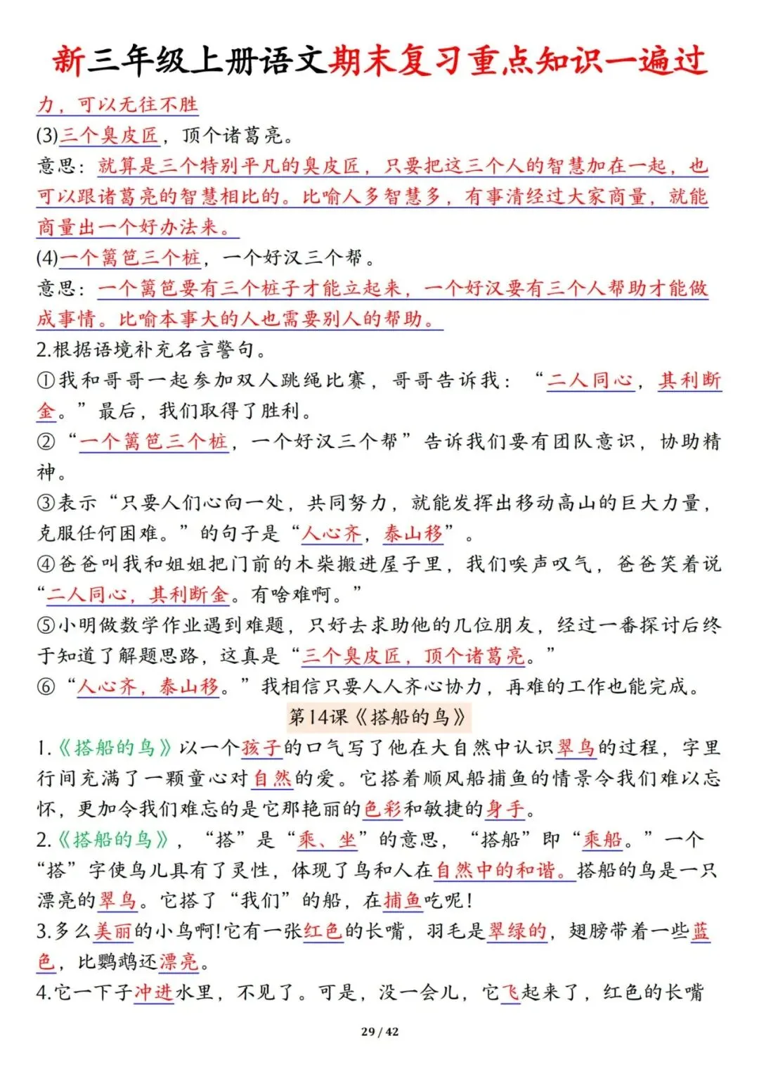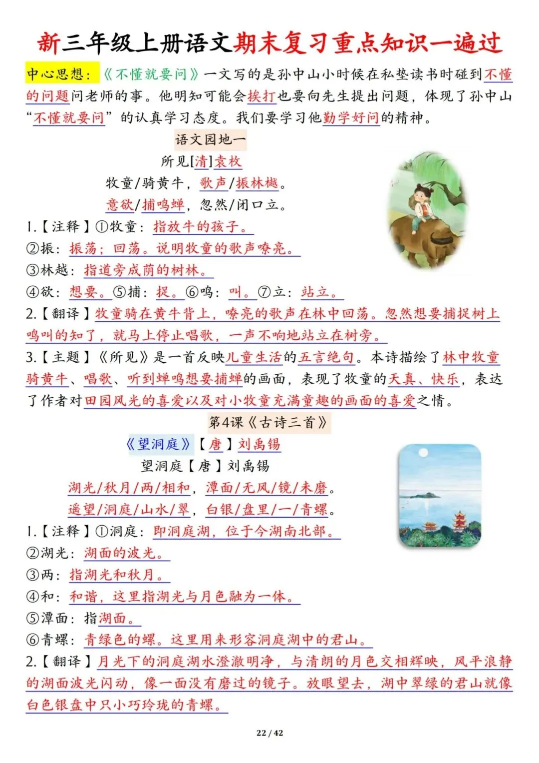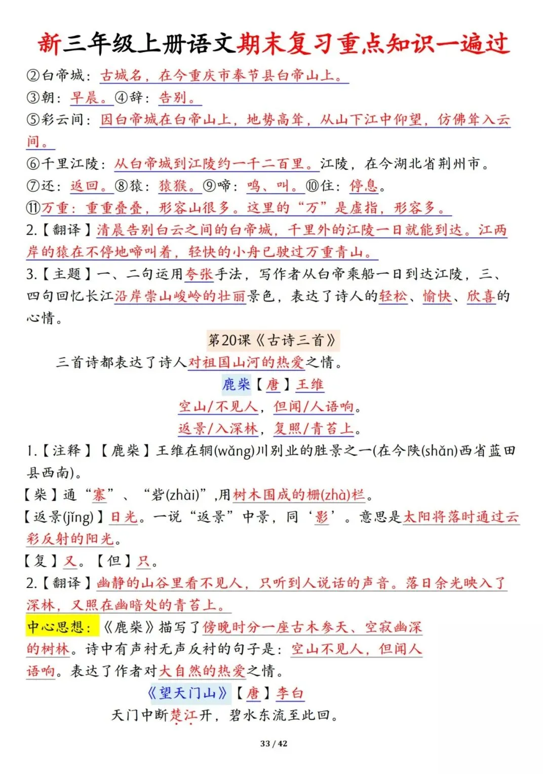 新三年级上册语文期末复习重点知识一遍过42页可打印电子版。