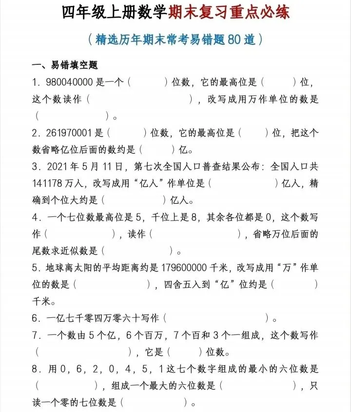 我们已为您整理了四年级上册数学期末复习重点必练(精选历年期末常考易错题80道),想给孩子做一下练习的家长可以保存。