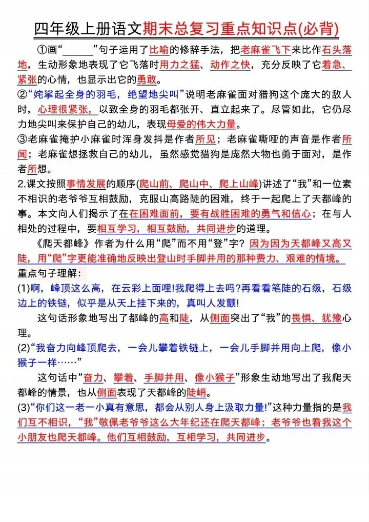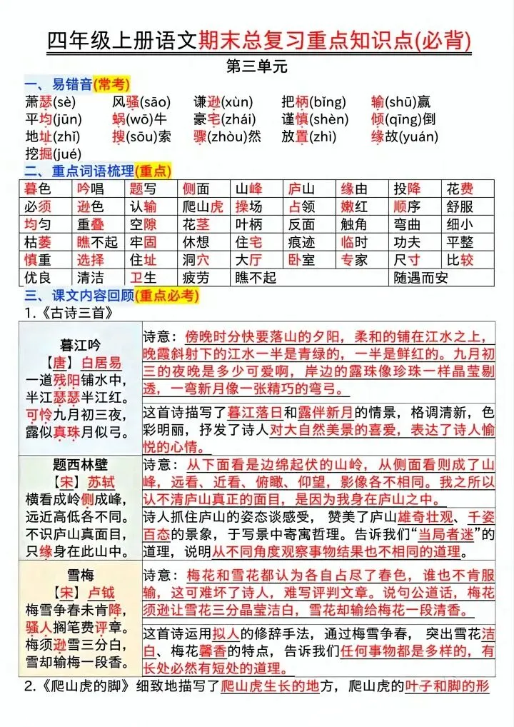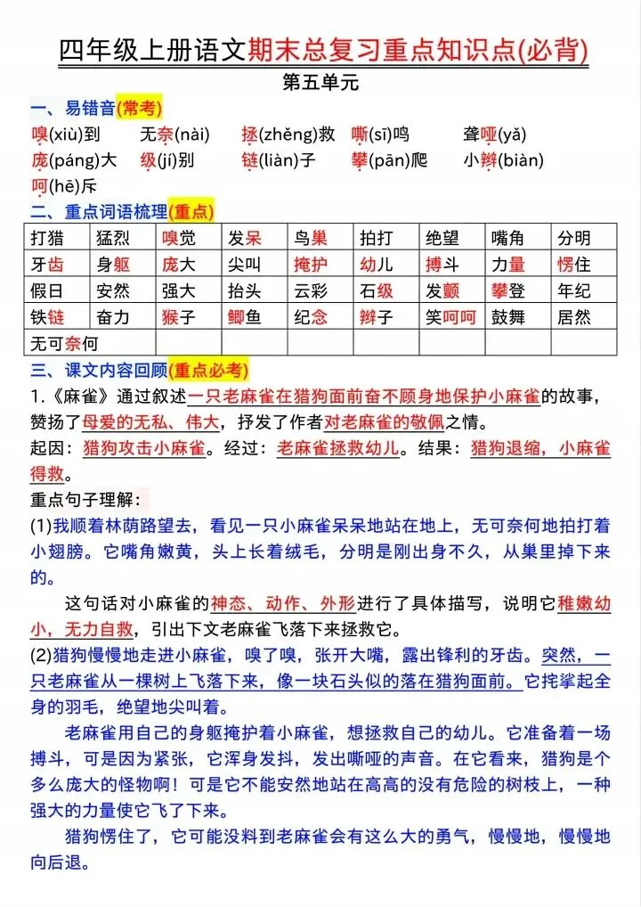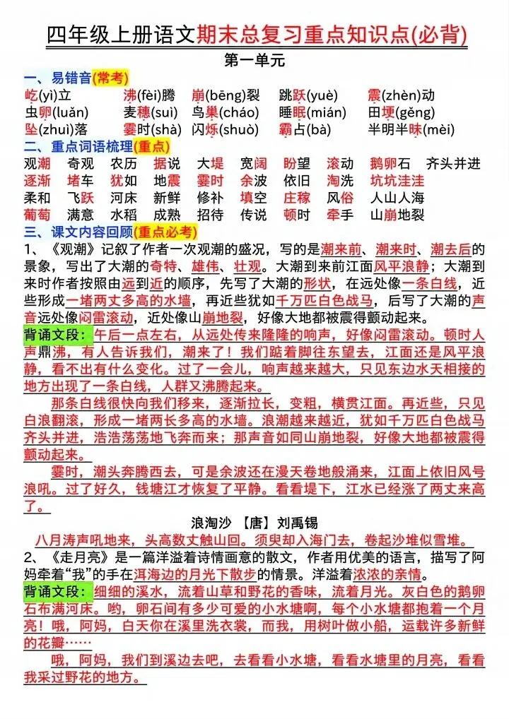 今天给大家带来四年级上册语文期末总复习重点知识必备,堪称期末冲刺的“通关秘籍”,帮孩子精准抓考点,高效备战期末考!期末复习时间紧,抓准重点才是提分王道!这份资料帮孩子夯实基础、吃透考点,语文高分稳稳拿捏!
