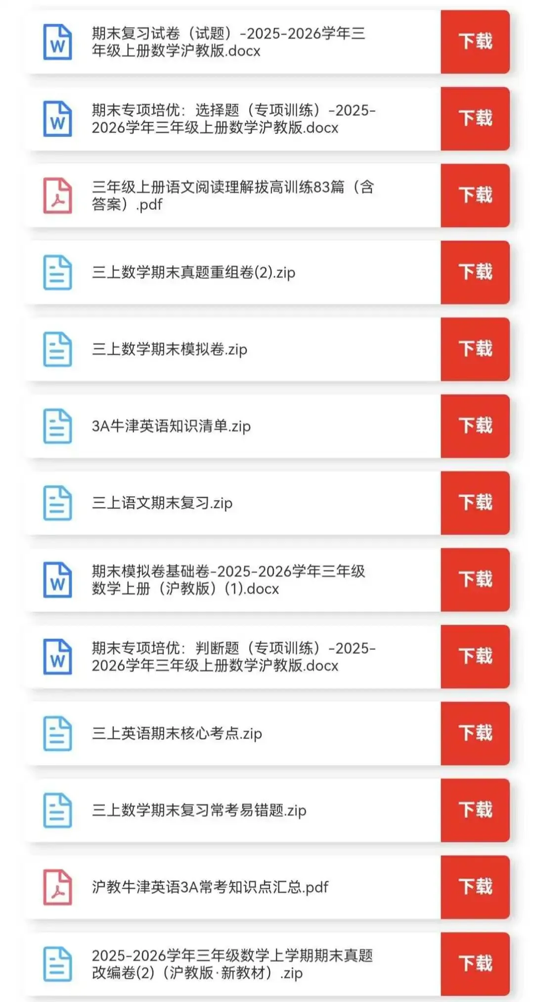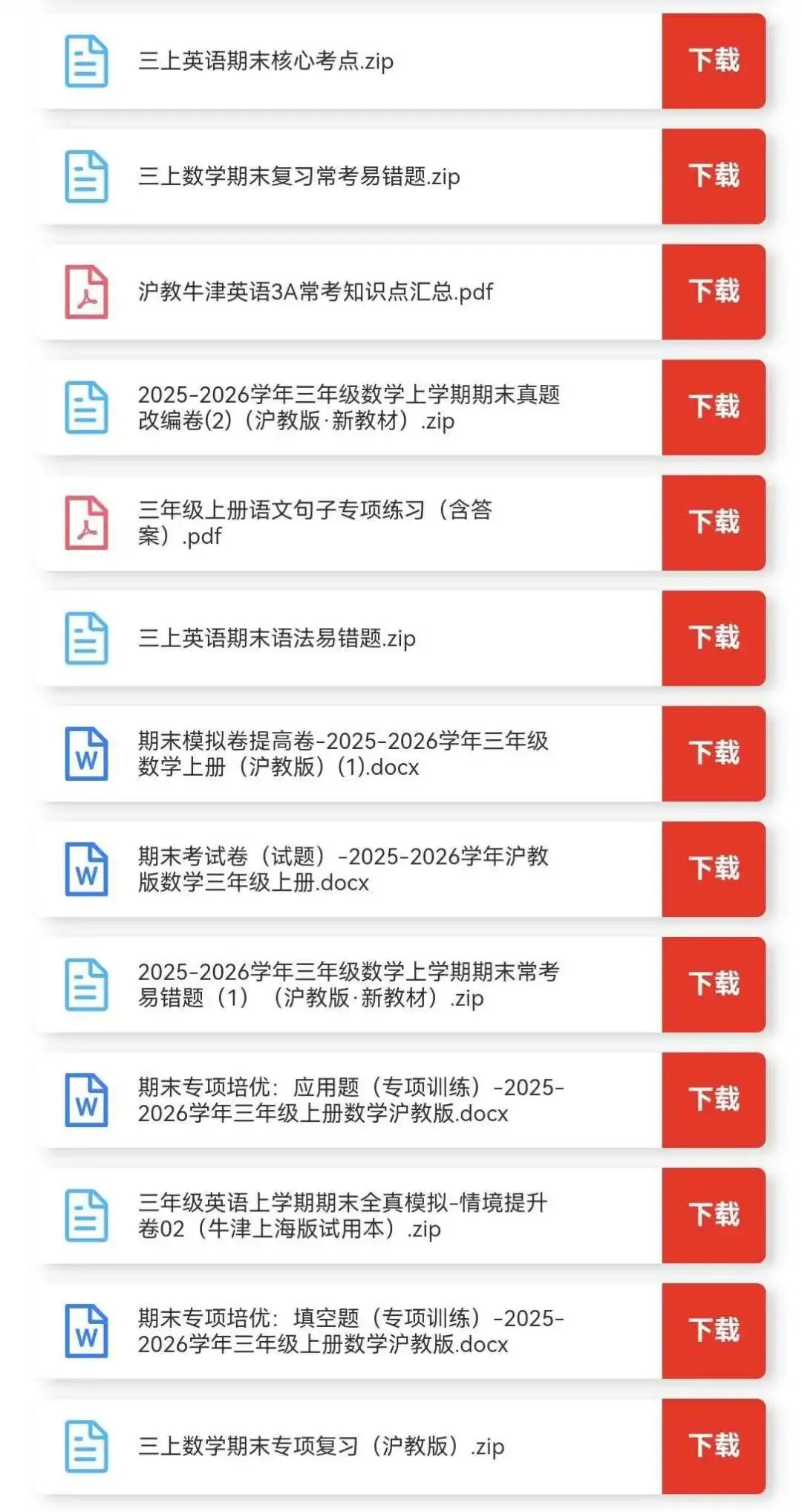 今天,小E老师为您精心整理了这份 “上海三年级上学期各科复习资料包” 。这份资料包适用于沪教版教材和牛津教材,内容紧扣上海教学与升学要求,涵盖了数学、语文、英语等核心学科。资料包内包含清晰的知识清单,助孩子将零散知识织成网络;精选的专项训练与易错题集,能有效巩固薄弱环节;还有实用的期末真题汇编,让孩子提前熟悉考场节奏。