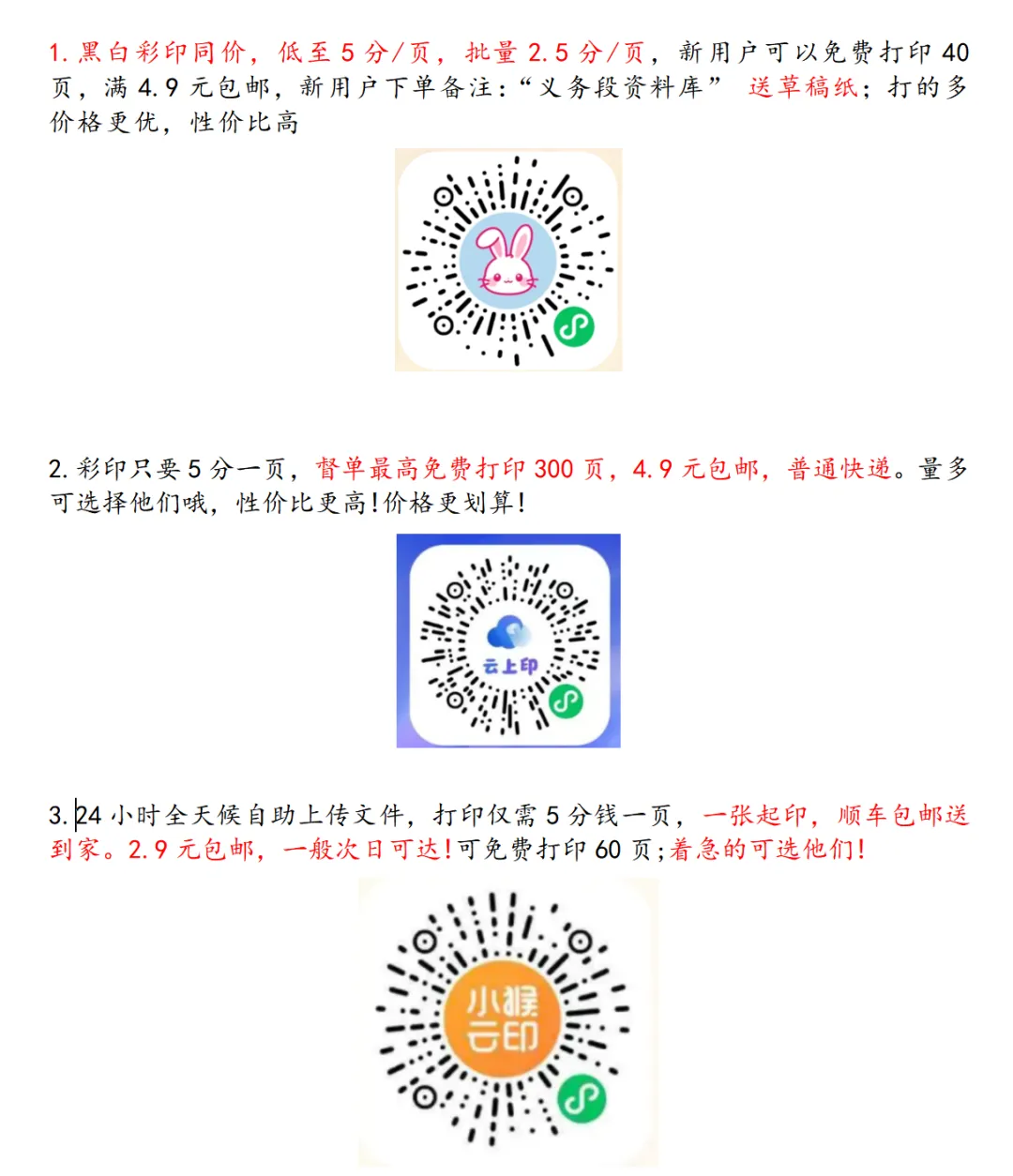 需要打印的家长可以直接复制链接扫下方任意一个二维码即可上传打印包邮到家