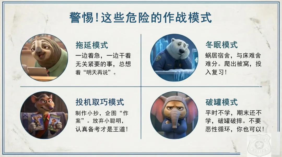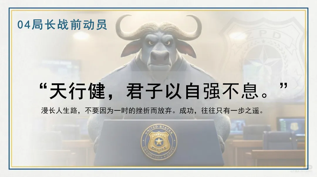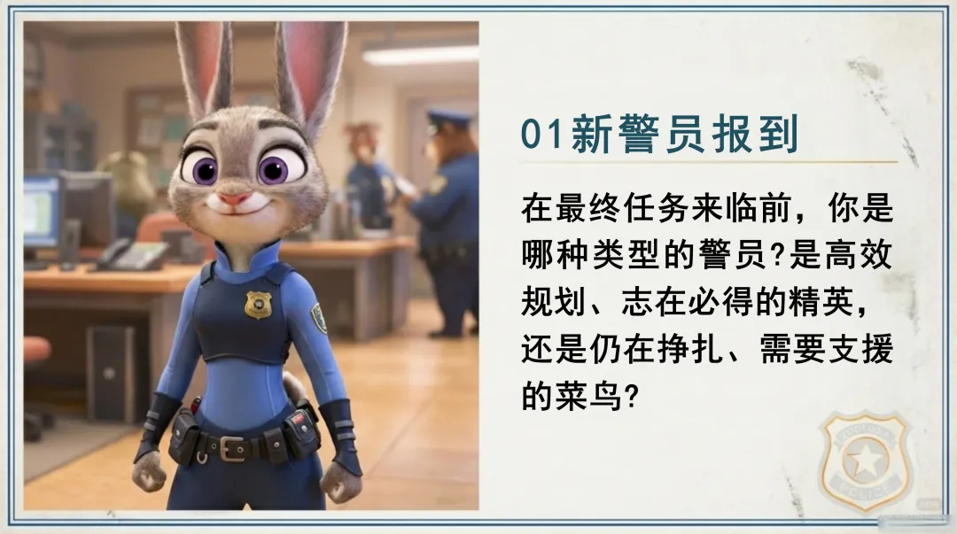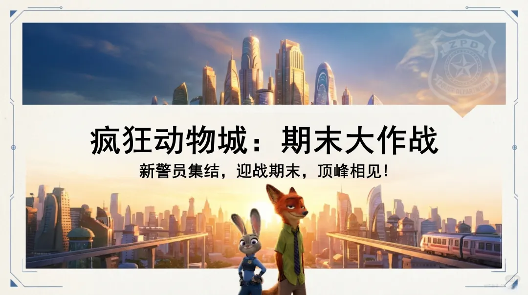 各位同学,大家好!欢迎来到今天的“疯狂动物城:期末大作战”动员大会。就像屏幕上展示的那样,我们每一位同学都是动物城的新警员,即将迎来期末这场硬仗。在这个充满挑战与机遇的时刻,让我们携手并肩,共同迎战期末,向着知识的顶峰勇敢攀登,期待我们在顶峰相见!