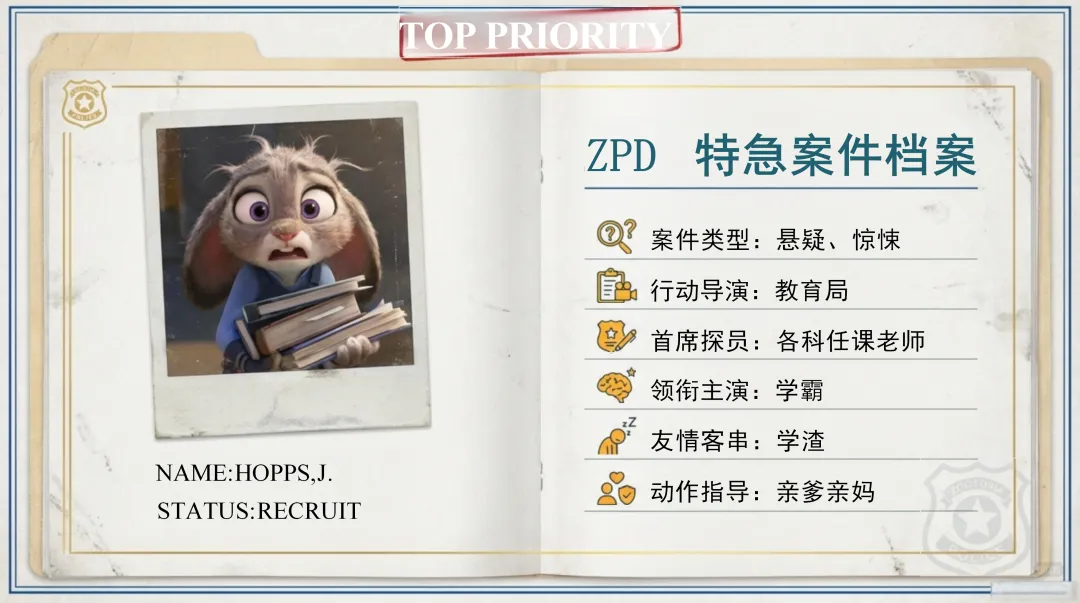 接下来,让我们一起看看这份ZPD特急案件档案。这场期末之战,就如同一个充满悬疑和惊悚的案件。教育局是我们的行动导演,为我们规划了这场期末战役的整体布局;各科任课老师则是我们的首席探员,他们将带领我们在知识的迷宫中寻找线索,攻克难关。学霸们是这场战役的领衔主演,他们凭借扎实的知识储备和良好的学习方法,将在期末考场上大放异彩;学渣们也不要气馁,你们可以作为友情客串,在这场战役中不断学习和成长。而我们的亲爹亲妈则是我们的动作指导,他们会在背后默默支持我们,为我们加油鼓劲。