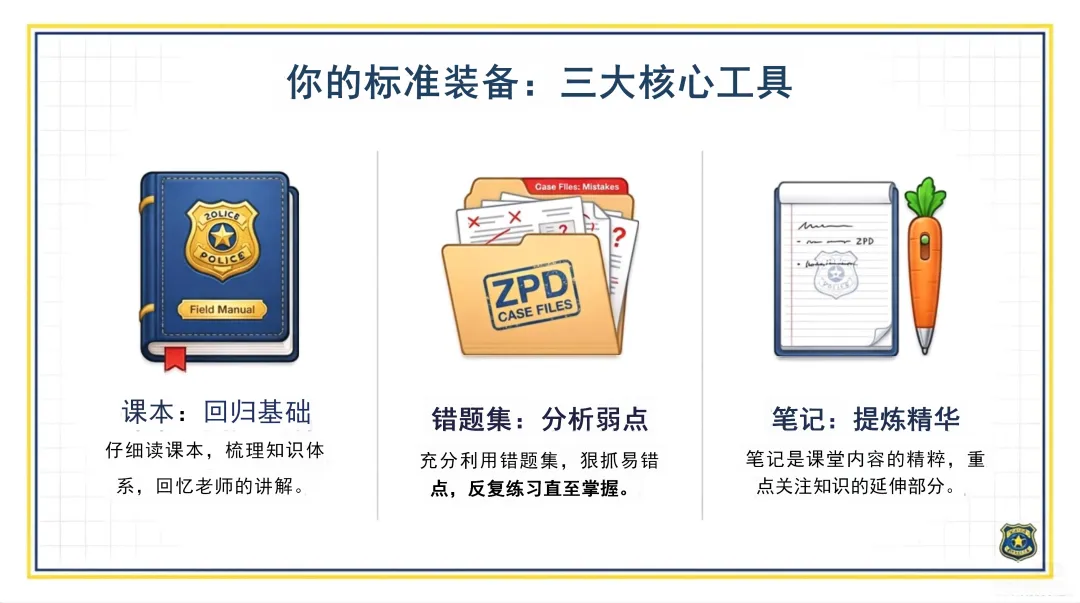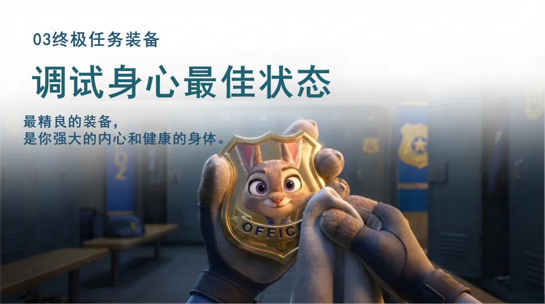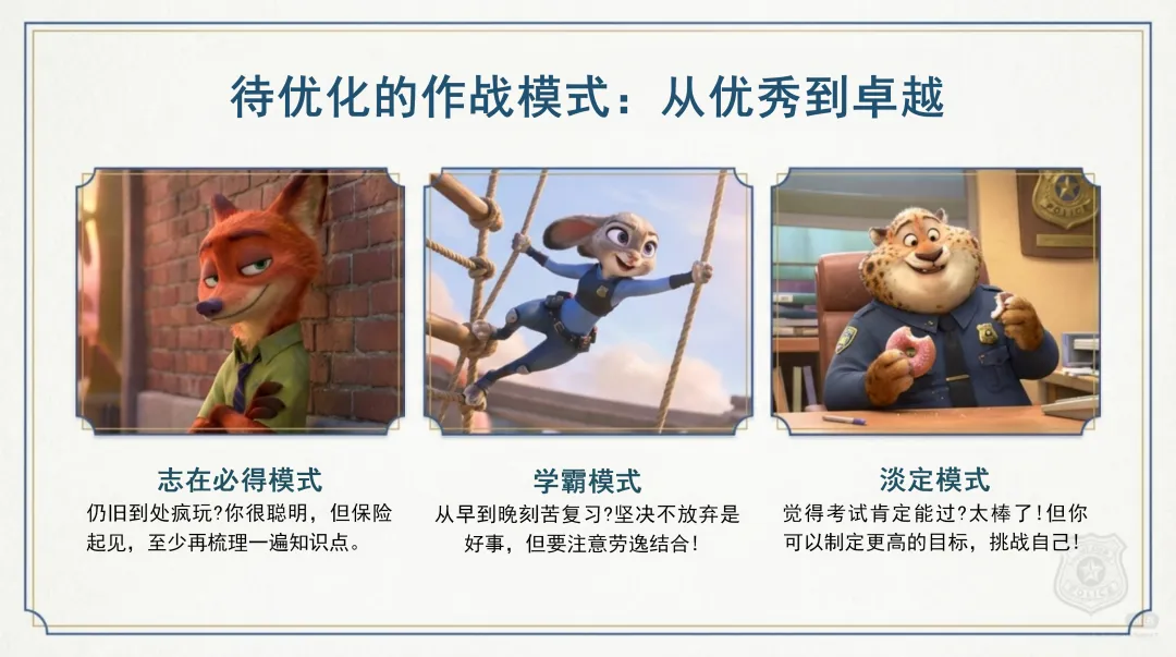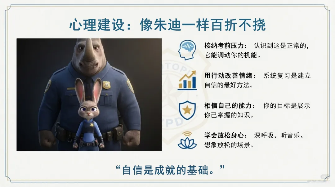 在心理建设方面,我们要像朱迪一样百折不挠。首先,我们要接纳考前压力,认识到这是正常的,它能调动我们的机能,让我们更加专注地学习。其次,我们要用行动改善情绪,系统复习是建立自信的最好方法,通过不断学习和进步,我们可以逐渐建立起自信心。我们要相信自己的能力,我们的目标是展示我们已掌握的知识,不要过分紧张和焦虑。同时,我们也要学会放松身心,深呼吸、听音乐、想象放松的场景,这些方法都可以帮助我们缓解压力,调整心态。