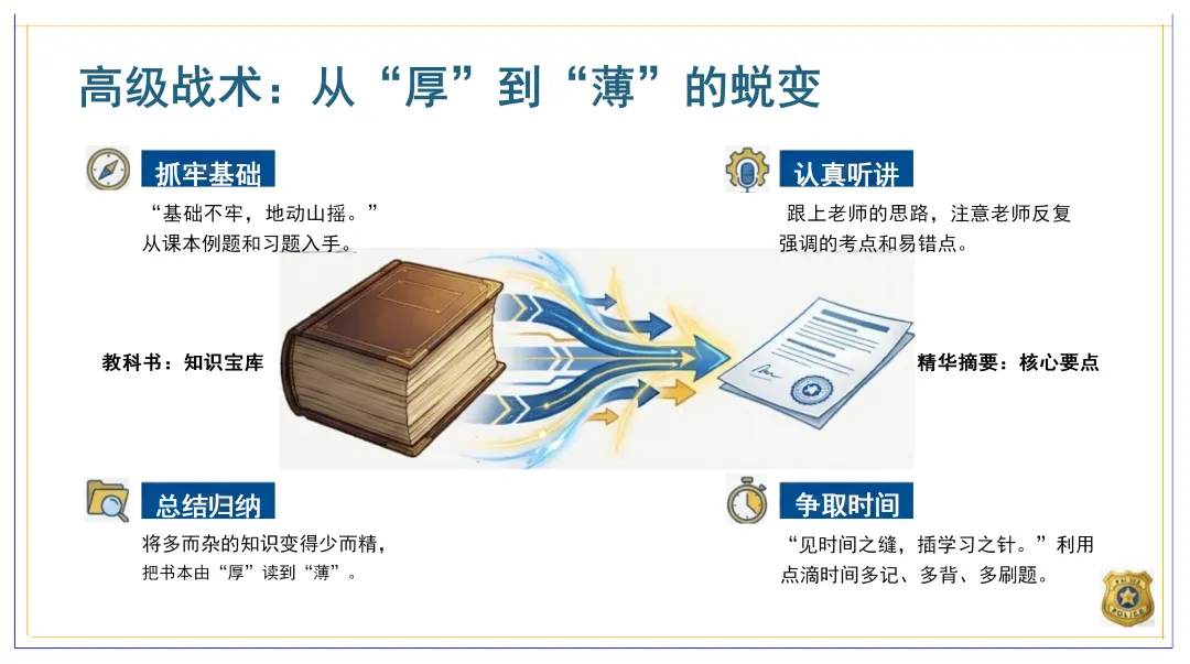 为了更好地掌握知识,我们要运用高级战术,实现从“厚”到“薄”的蜕变。抓牢基础是关键,“基础不牢,地动山摇。”我们要从课本例题和习题入手,打牢知识基础。认真听讲也是非常重要的,跟上老师的思路,注意老师反复强调的考点和易错点。我们要将多而杂的知识变得少而精,把书本由“厚”读到“薄”,总结归纳知识的核心要点。同时,我们要争取时间,“见时间之缝,插学习之针。”利用点滴时间多记、多背、多刷题,提高学习效率。