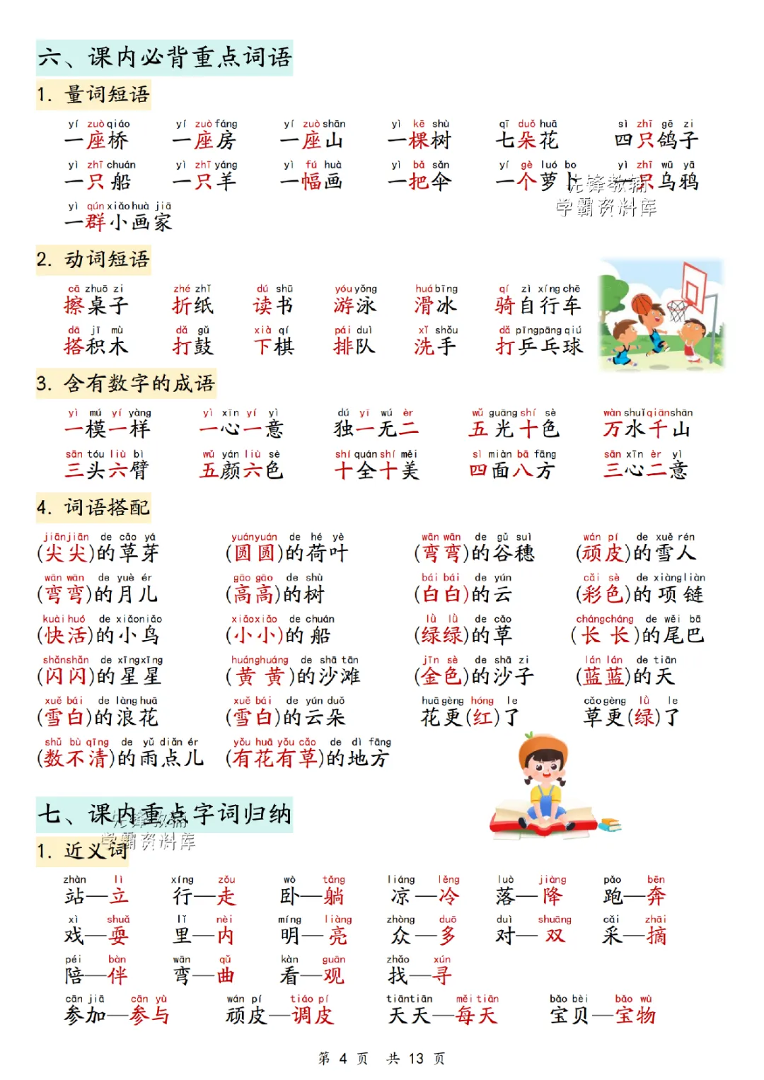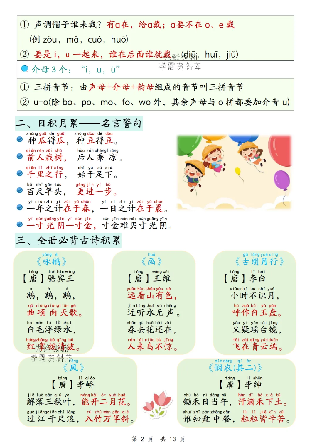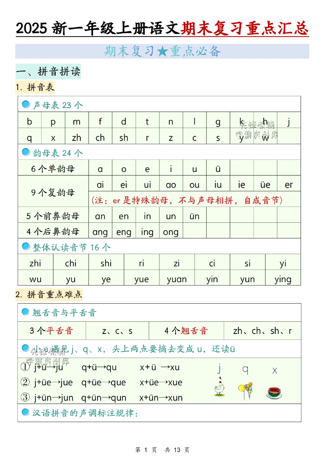 2025秋一年级上册语文《期末复习重点汇总》,电子版可下载打印。系统梳理拼音、生字、词语、句子及必背课文等核心模块,精准锁定高频考点,帮助孩子高效复习,夯实语文基础。建议家长下载使用,助力孩子轻松备考~