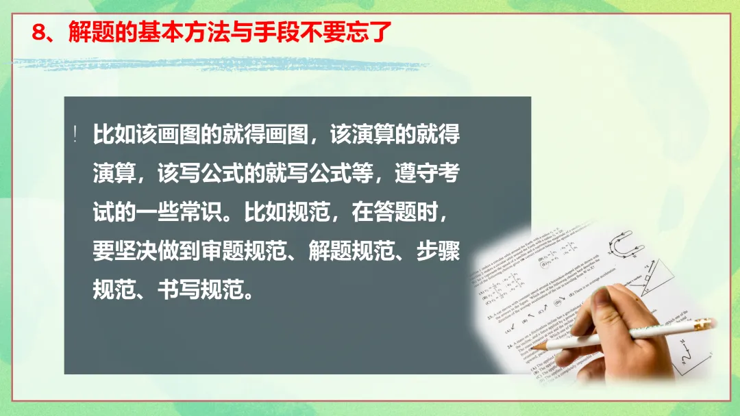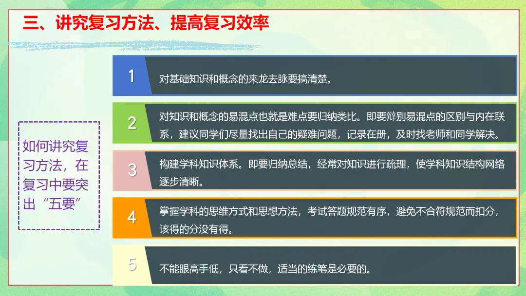 在复习中要突出“五要”。第一,对基础知识和概念的来龙去脉要搞清楚。第二,对知识和概念的易混点也就是难点要归纳类比,辨别易混点的区别与内在联系,建议同学们尽量找出自己的疑难问题,记录在册,及时找老师和同学解决。第三,构建学科知识体系,归纳总结,经常对知识进行疏理,使学科知识结构网络逐步清晰。第四,掌握学科的思维方式和思想方法,考试答题规范有序,避免不合规范而扣分,该得的分没有得。第五,不能眼高手低,只看不做,适当的练笔是必要的。