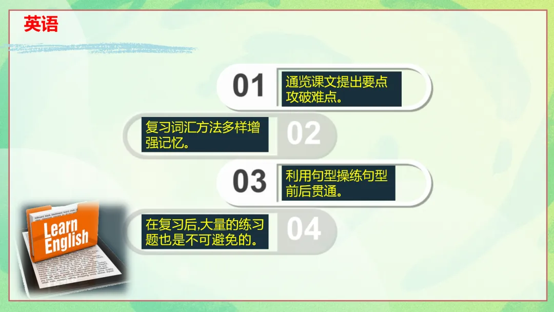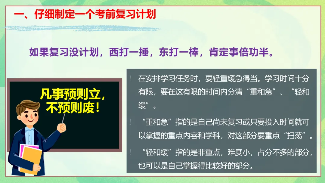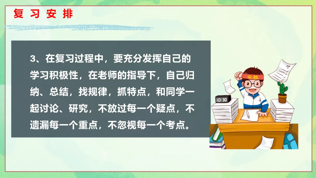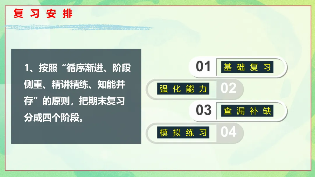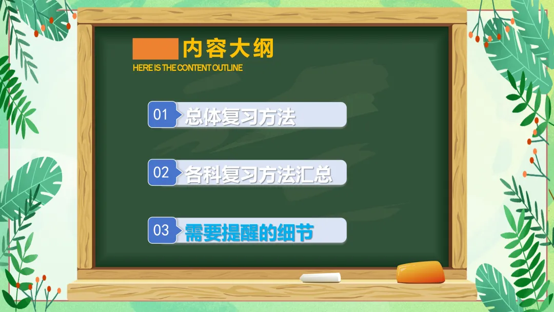 接下来,我们的班会将围绕三个方面展开。首先是总体复习方法,为大家梳理期末复习的整体思路;其次是各科复习方法汇总,针对不同学科给出具体的复习策略;最后是需要提醒的细节,帮助大家在复习和考试过程中避免一些常见的问题。