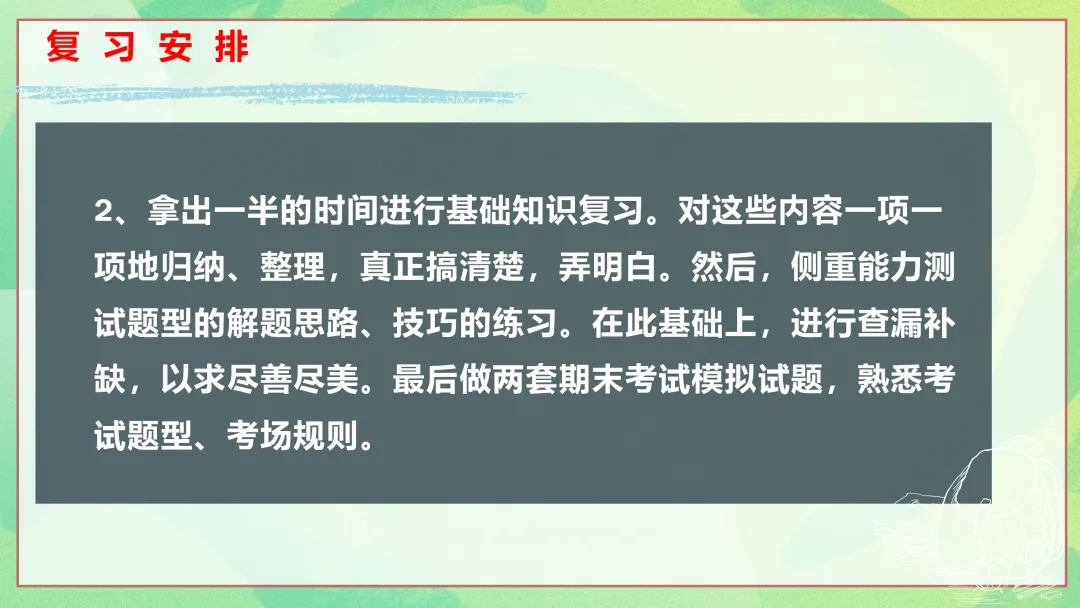 我们要拿出一半的时间进行基础知识复习。对这些内容一项一项地归纳、整理,真正搞清楚,弄明白。然后,侧重能力测试题型的解题思路、技巧的练习。在此基础上,进行查漏补缺,以求尽善尽美。最后做两套期末考试模拟试题,熟悉考试题型、考场规则。