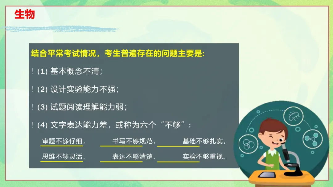 结合平常考试情况,考生普遍存在的问题主要有以下几点:基本概念不清;设计实验能力不强;试题阅读理解能力弱;文字表达能力差,或称为六个“不够”,即审题不够仔细,书写不够规范,思维不够灵活,表达不够清楚,基础不够扎实,实验不够重视。下面我们来看一下生物复习策略。