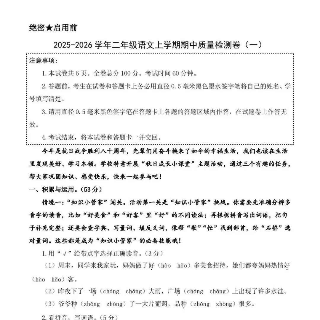 2025年人教部编版二年级上册语文《期中拔尖押题测试卷》(共5套,附答案)|完整电子版可打印