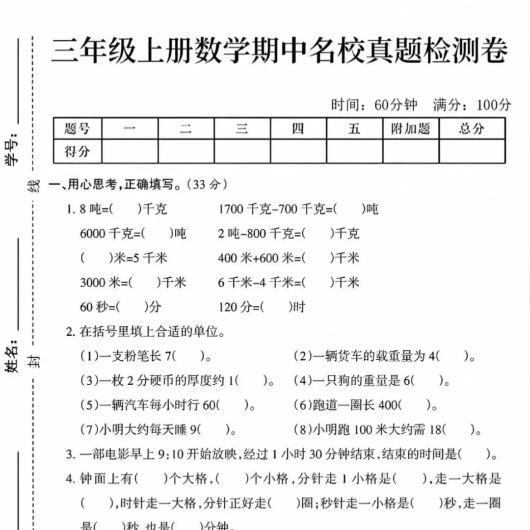 2025年人教版三年级上册数学《期中名校真题测试卷》(共5套,附答案)|完整电子版可打印