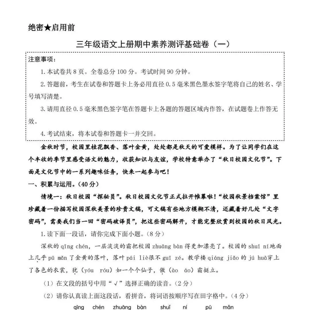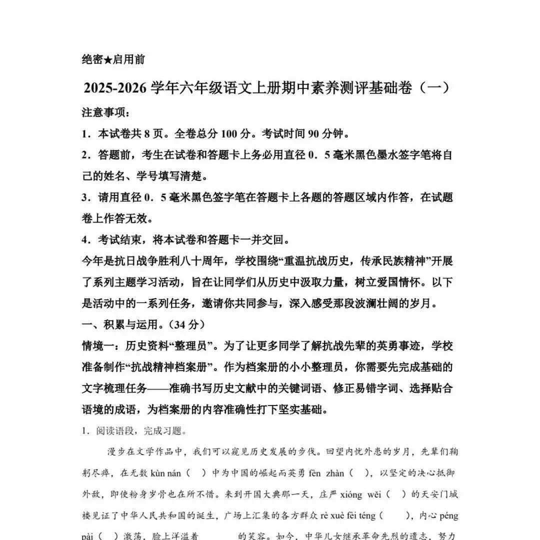 2025年人教部编版六年级上册语文《期中情境押题摸底测试卷》(共5套,附答案)|完整电子版可打印