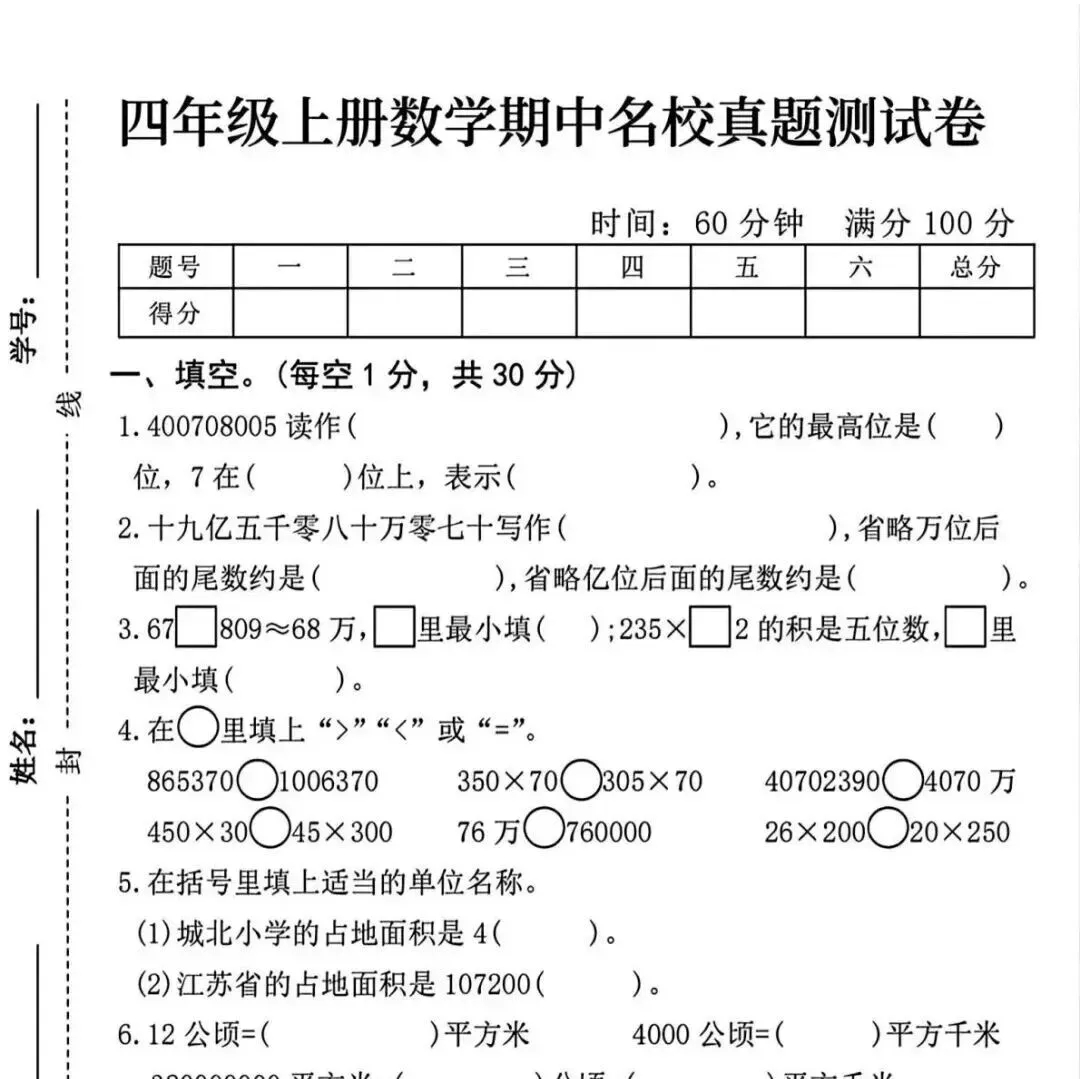 2025年人教版四年级上册数学《期中名校真题测试卷》(共6套,附答案)|完整电子版可打印