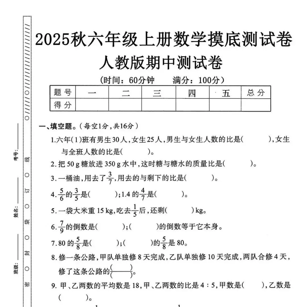 2025年人教版六年级上册数学《期中押题摸底测试卷》(共5套,附答案)|完整电子版可打印