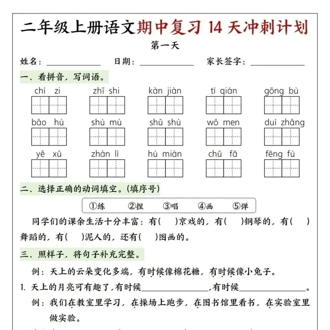 2025年《二年级上册语文期中复习14天冲刺计划(带答案)》,文末附完整版免费下载链接。
