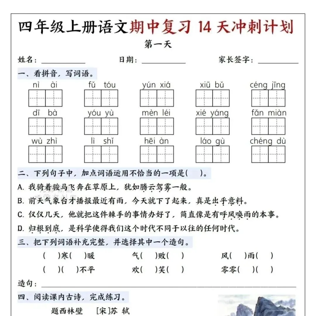 2025年《四年级上册语文期中复习14天冲刺计划(带答案)》,文末附完整版免费下载链接。