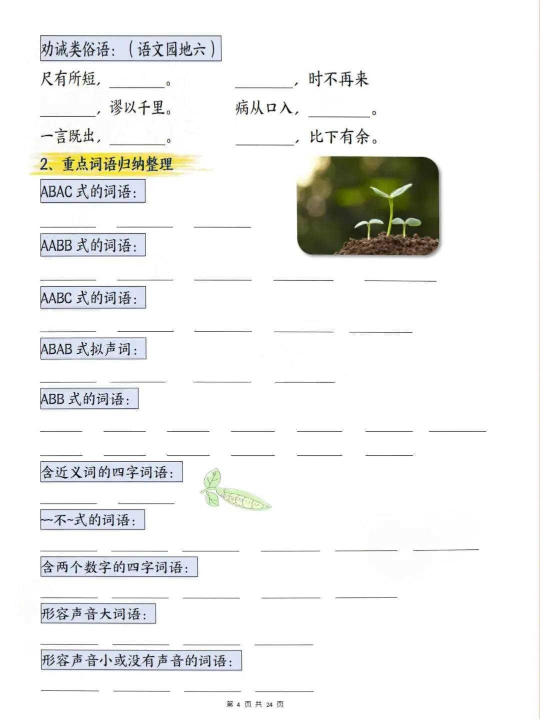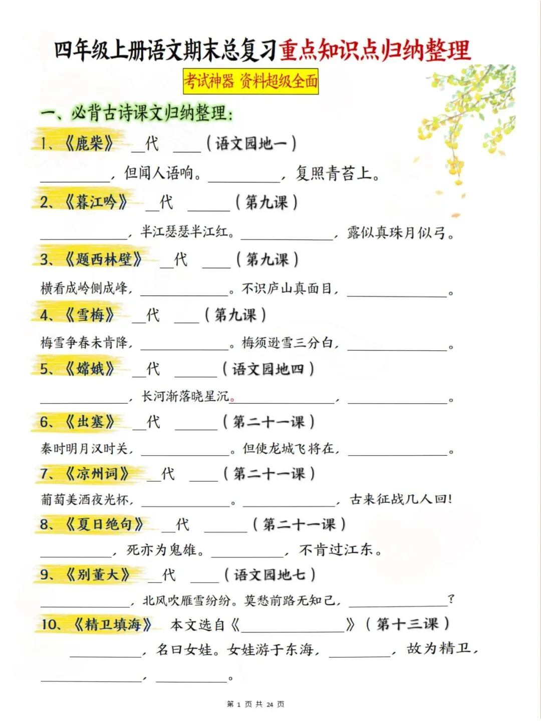 又到了整理复习资料的时候了。这份四年级上册语文的资料,是我精挑细选出来的。48页的可打印PDF,涵盖了所有期末复习的重点知识点。每一道题都有答案,非常适合孩子自学或者家长辅导。希望能帮孩子们在期末考试中取得优异的成绩。